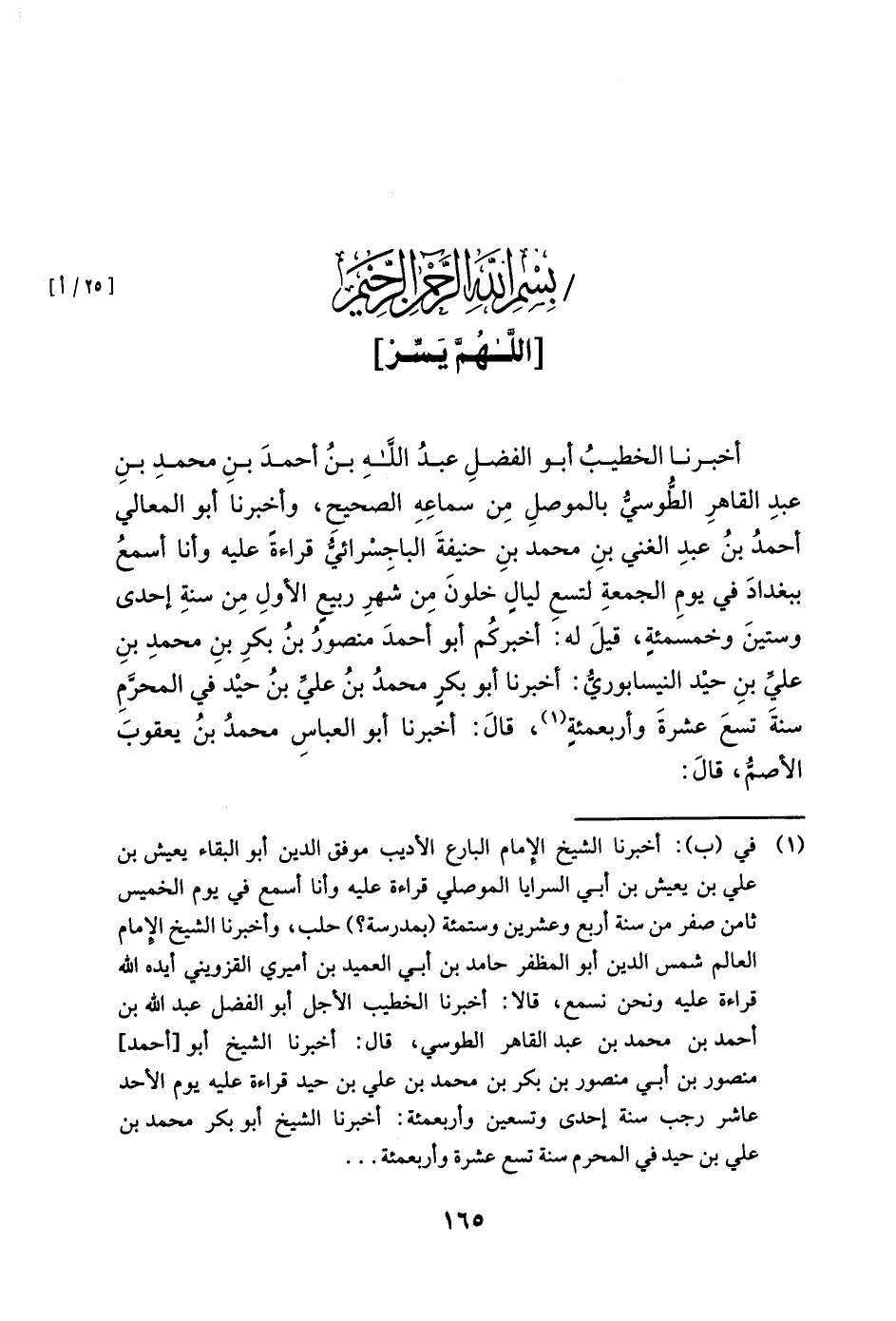 أَخْبَرَنَا الخطيب أَبُو الْفَضْلِ عَبْدُ اللَّهِ بْنُ أَحْمَدَ بْنِ مُحَمَّدِ بْنِ عَبْدِ الْقَاهِرِ الطُّوسِيُّ بِالْمَوْصِلِ مِنْ سَمَاعِهِ الصَّحِيحِ، وَأَخْبَرَنَا أَبُو الْمَعَالِي أَحْمَدُ بْنُ عبد الغني بن محمد بن حنيفة الباجسرائي قراءةً عليه وأنا أسمع ببغداد فِي يَوْمِ الْجُمُعَةِ لِتِسْعِ ليالٍ خَلَوْنَ مِنْ شَهْرِ رَبِيعِ الأَوَّلِ مِنْ سَنَةِ إِحْدَى وَسِتِّينَ وخمسمئةٍ، قِيلَ لَهُ: أَخْبَرَكُمْ أَبُو أَحْمَدَ مَنْصُورِ بْنِ بَكْرِ بْنِ مُحَمَّدِ بْنِ عَلِيِّ بْنِ حَيْدٍ النيسابوري: أَخْبَرَنَا أَبُو بَكْرٍ مُحَمَّدُ بْنُ عَلِيِّ بْنِ حيد في المحرم سنة تسع عشرة وأربعمئةٍ، قال: أخبرنا أبو العباس محمد بن يعقوب الأصم، قال: