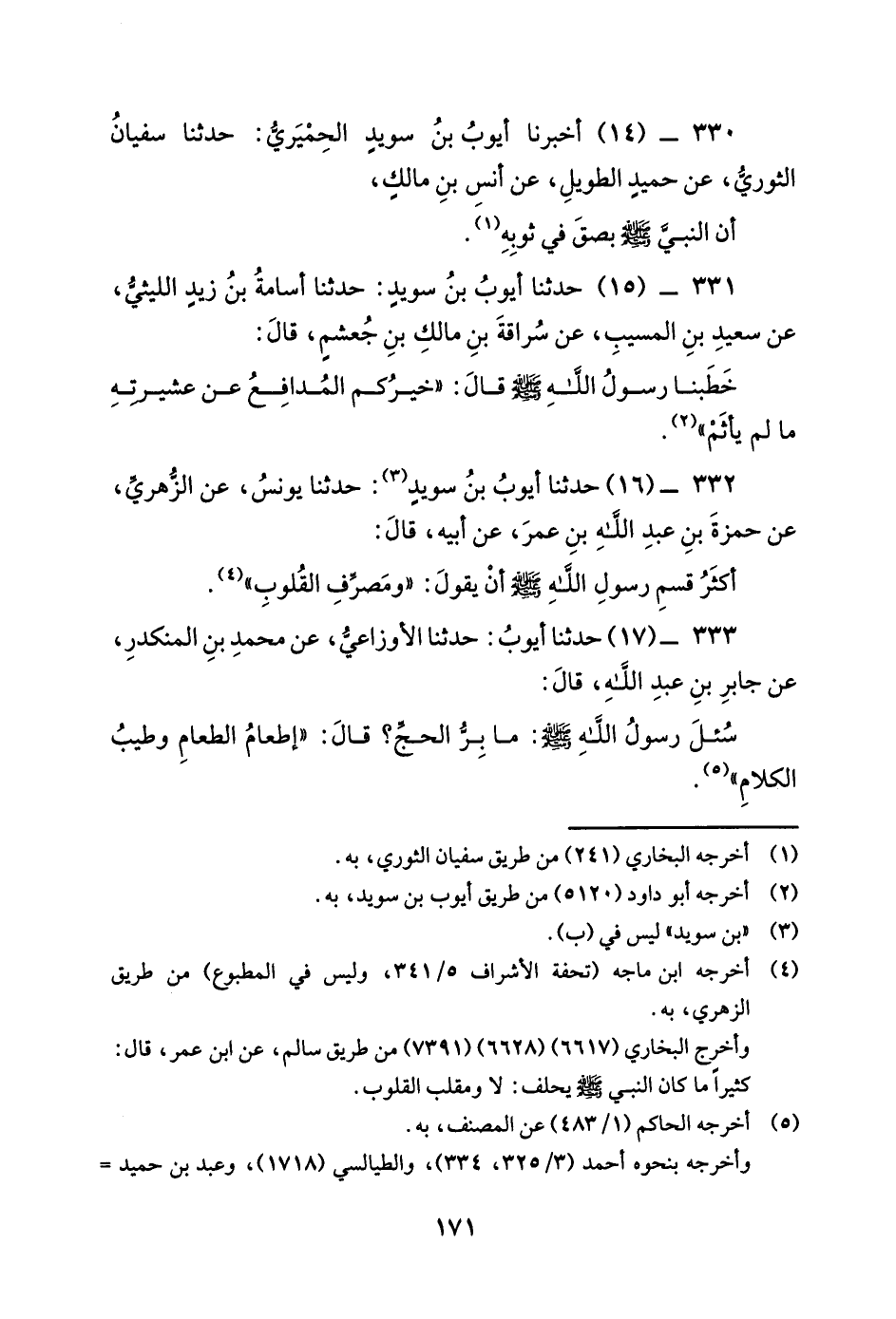 330 - (14) أخبرنا أيوب بن سويد الحميري: حدثنا سُفْيَانُ الثَّوْرِيُّ عَنْ حميدٍ الطَّوِيلِ، عَنْ أَنَسِ بْنِ مَالِكٍ،