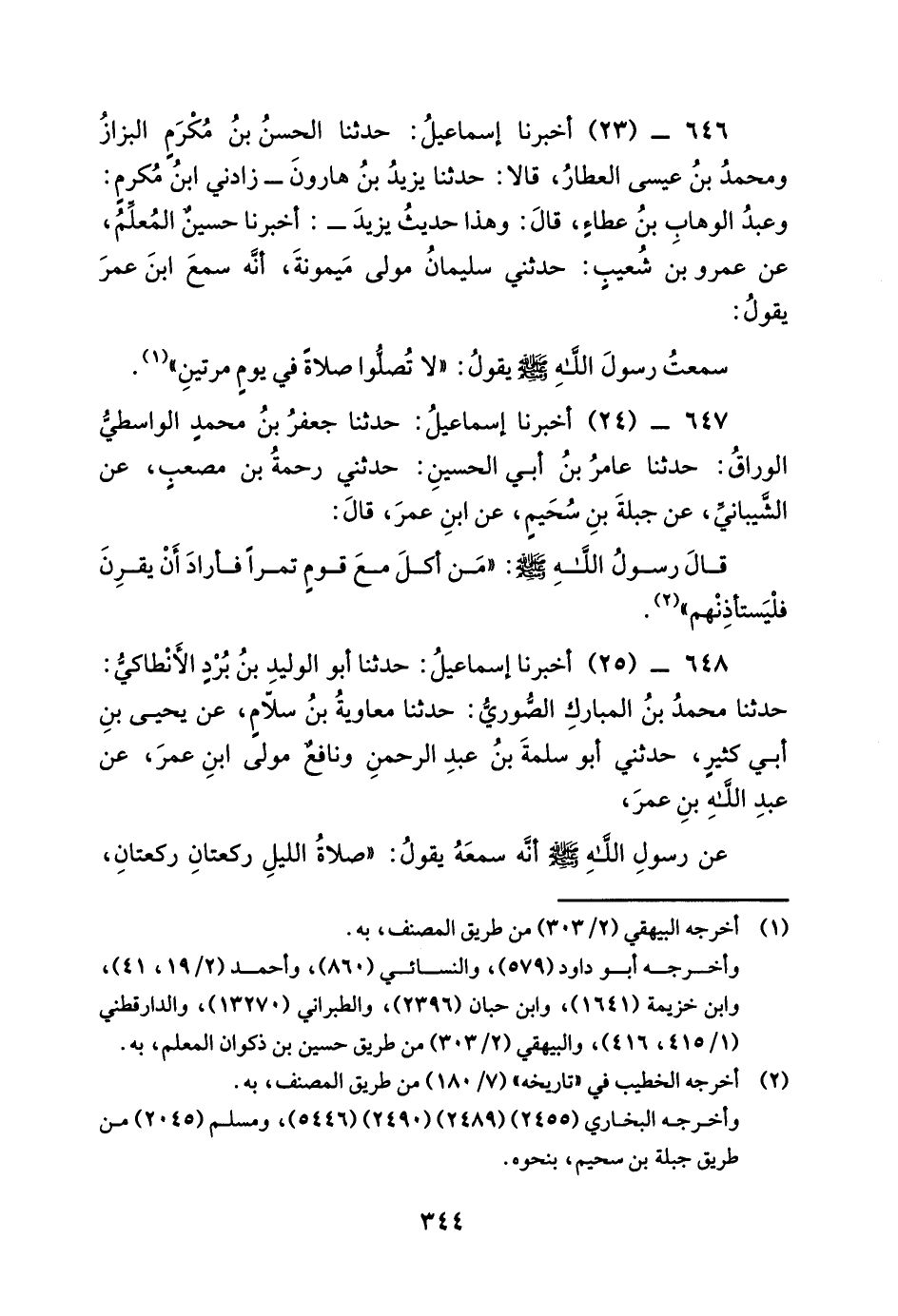647 - (24) أخبرنا إسماعيل: حدثنا جعفر بن محمد الواسطي الوراق: حدثنا عامر بن أبي الحسين: حدثني رحمة بن مصعبٍ، عن الشيباني، عن جبلة بن سحيمٍ، عَنِ ابْنِ عُمَرَ، قَالَ: