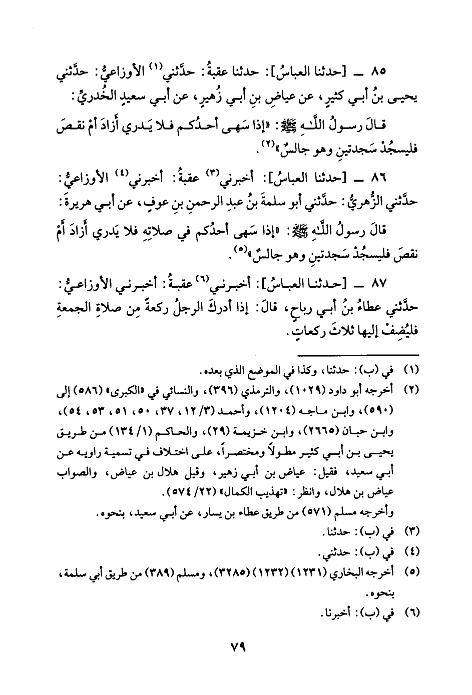 86 - [حدثنا العباس] أَخْبَرَنِي عُقْبَةُ أَخْبَرَنِي الأَوْزَاعِيُّ حَدَّثَنِي الزُّهْرِيُّ حَدَّثَنِي أبوسلمة بْنِ عَبْدِ الرَّحْمَنِ بْنِ عَوْفٍ عَنْ أَبِي هُرَيْرَةَ قَالَ رَسُولُ اللَّهِ صَلَّى اللَّهُ عَلَيْهِ وَسَلَّمَ إذا سها أحدكم في صلاته فلايدري أَزَادَ أَمْ نَقَصَ فَلْيَسْجُدْ سَجْدَتَيْنِ وَهُوَ جَالِسٌ.