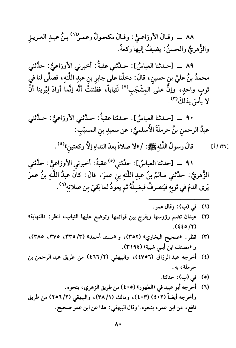 91 - [حدثنا العباس] حَدَّثَنِي عُقْبَةُ أَخْبَرَنِي الأَوْزَاعِيُّ حَدَّثَنِي الزُّهْرِيُّ حَدَّثَنِي سالم بن عبد الله بن عمر قال كَانَ عَبْدُ اللَّهِ بْنُ عُمَرَ يَرَى الدَّمَ فِي ثَوْبِهِ فَيَنْصَرِفُ فَيَغْسِلُهُ ثُمَّ يَعُودُ لِمَا بقي من صلاته.
