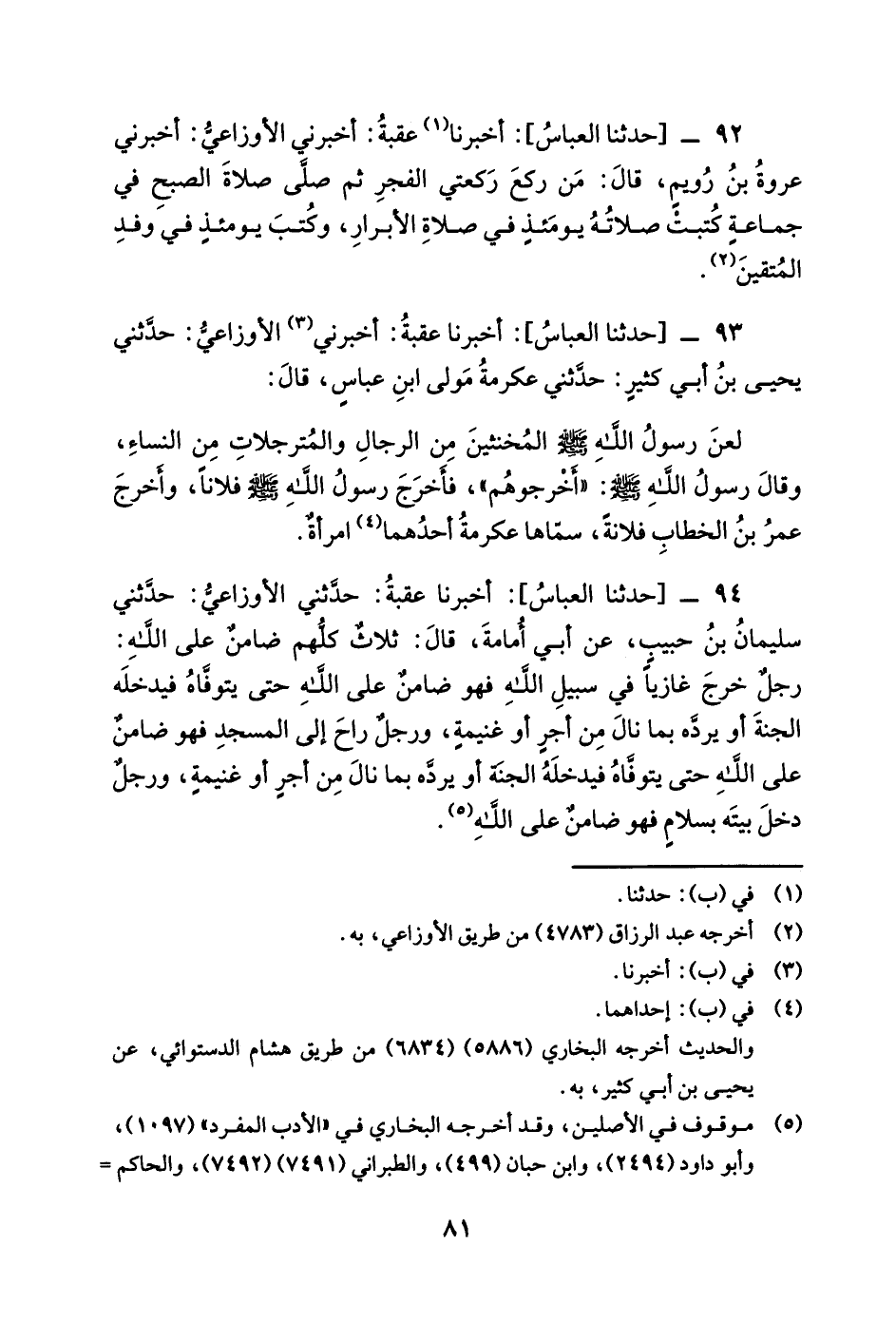94 - [حدثنا العباس] أخبرنا عُقْبَةُ حَدَّثَنِي الأَوْزَاعِيُّ حَدَّثَنِي سُلَيْمَانُ بْنُ حَبِيبٍ عن أبي أمامة قال ثلاث كُلُّهُمْ ضَامِنٌ عَلَى اللَّهِ رَجُلٌ خَرَجَ غَازِيًا فِي سَبِيلِ اللَّهِ فَهُوَ ضَامِنٌ عَلَى اللَّهِ حَتَّى يَتَوَفَّاهُ فَيُدْخِلَهُ الْجَنَّةَ أَوْ يَرُدَّهُ بِمَا نَالَ مِنْ أَجْرٍ أَوْ غَنِيمَةٍ وَرَجُلٌ رَاحَ إِلَى الْمَسْجِدِ فَهُوَ ضَامِنٌ عَلَى اللَّهِ حَتَّى يتوفاه فيدخله الجنة أويرده بما نال من أجر أوغنيمة وَرَجُلٌ دَخَلَ بَيْتَهُ بِسَلامٍ فَهُوَ ضَامِنٌ عَلَى الله.