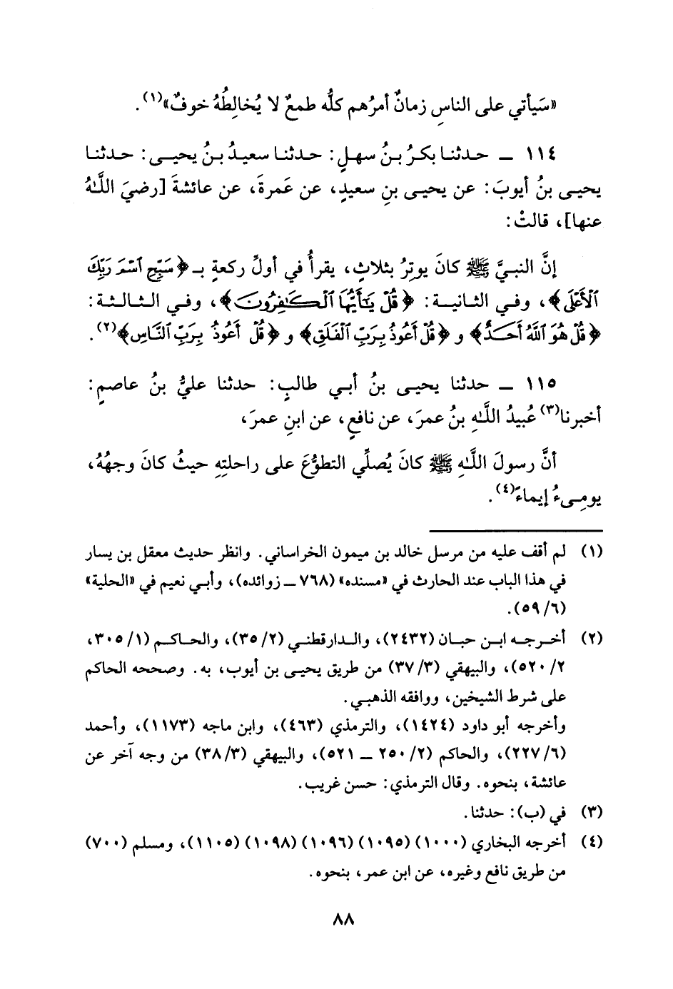 114 - حدثنا بكر بن سهل حدثنا شعيب بن يحيى حدثنا يَحْيَى بْنُ أَيُّوبَ عَنْ يَحْيَى بْنِ سَعِيدٍ عن عمرة عن عائشة [رضي الله عنها] قَالَتْ إِنَّ النَّبِيَّ صَلَّى اللَّهُ عَلَيْهِ وَسَلَّمَ كَانَ يُوتِرُ بِثَلاثٍ يَقْرَأُ فِي أَوَّلِ رَكْعَةٍ بـ {سبح اسم ربك الأعلى} وفي الثانية {قل يأ يها الْكَافِرُونَ} وَفِي الثَّالِثَةِ {قُلْ هُوَ اللَّهُ أَحَدٌ} و {قل أعوذ برب الفلق} و {قل أعوذ برب الناس}.