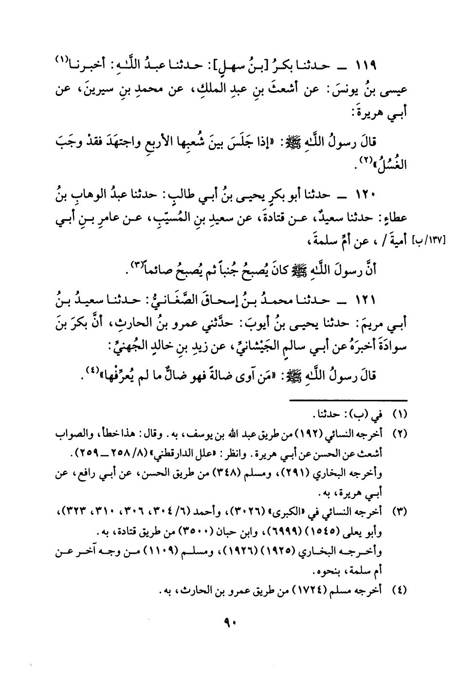 119 - حَدَّثَنَا بَكْرُ [بْنُ سَهْلٍ] حَدَّثَنَا عَبْدُ اللَّهِ [بن يوسف] أخبرنا عِيسَى بْنُ يُونُسَ عَنْ أَشْعَثَ بْنِ عَبْدِ الْمَلِكِ عَنْ مُحَمَّدِ بْنِ سِيرِينَ عَنْ أَبِي هُرَيْرَةَ قَالَ رَسُولُ اللَّهِ صَلَّى اللَّهُ عَلَيْهِ وَسَلَّمَ إِذَا جَلَسَ بَيْنَ شُعَبِهَا الأَرْبَعِ وَاجْتَهَدَ فَقَدْ وجب الغسل.