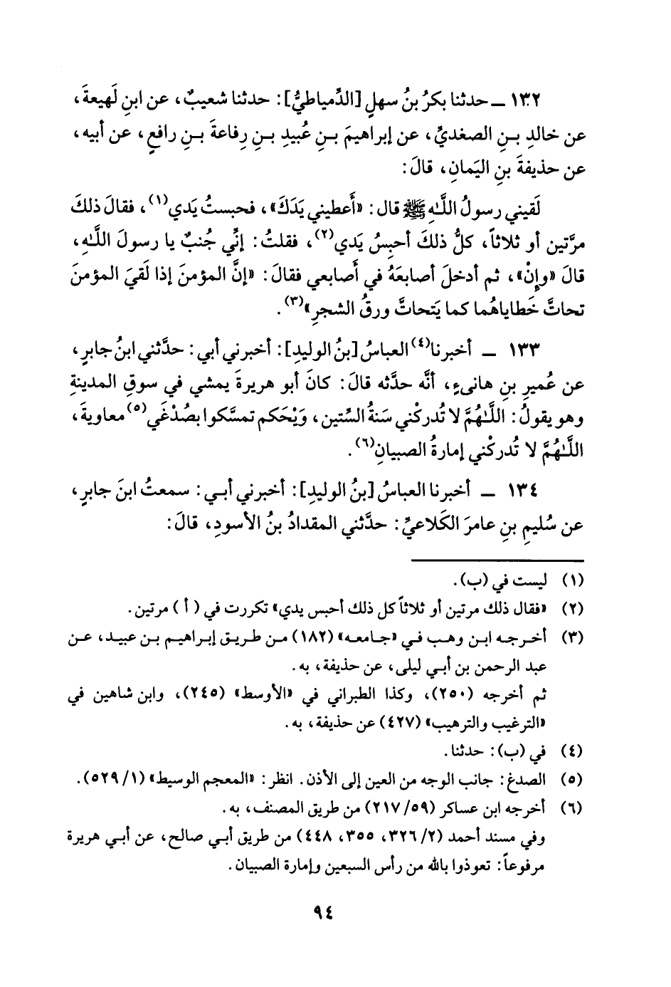 132 - حدثنا بكر بن سهل [الدمياطي] حدثنا شُعَيْبٌ عَنِ ابْنِ لَهِيعَةَ عَنْ خَالِدِ بْنِ الصُّغْدِيِّ عَنْ إِبْرَاهِيمَ بْنِ عُبَيْدِ بْنِ رِفَاعَةَ بْنِ رَافِعٍ عَنْ أَبِيهِ عَنْ حُذَيْفَةَ بْنِ الْيَمَانِ قَالَ لَقِيَنِى رَسُولُ اللَّهِ صَلَّى اللَّهُ عَلَيْهِ وَسَلَّمَ قَالَ أَعْطِنِي يَدَكَ فَحَبَسْتُ يَدِي فَقَالَ ذَلِكَ مَرَّتَيْنِ أَوْ ثَلاثًا كُلُّ ذَلِكَ أَحْبِسَ يَدِي فَقُلْتُ إِنِّي جُنُبٌ يَا رَسُولَ اللَّهِ قَالَ وَإِنْ ثُمَّ أَدْخَلَ أَصَابِعَهُ فِي أَصَابِعِي فَقَالَ إِنَّ الْمُؤْمِنَ إِذَا لَقِيَ الْمُؤْمِنَ تحات خطاياهما كما يتحات ورق الشجر.