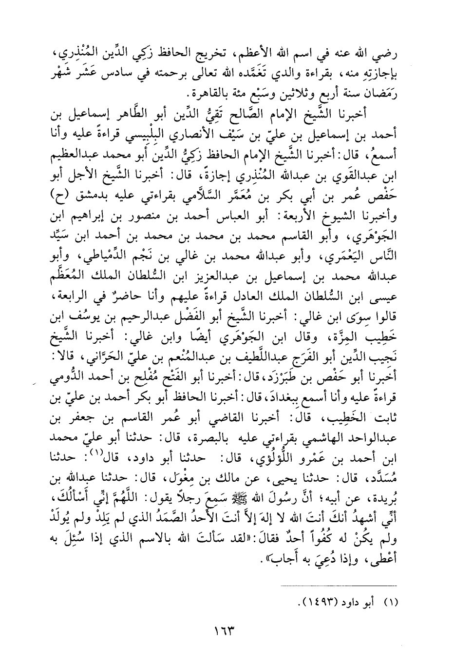 أَخْبَرَنَا الشَّيْخُ الإِمَامُ الصَّالِحُ تَقِيُّ الدِّينِ أَبُو الطَّاهِرِ إِسْمَاعِيلُ بْنُ أَحْمَدَ بْنِ إِسْمَاعِيلَ بْنِ عَلِيِّ بْنِ سَيْفٍ الأَنْصَارِيُّ الْبِلْبِيسِيُّ قِرَاءَةً عَلَيْهِ وَأَنَا أَسْمَعُ، قَالَ: أَخْبَرَنَا الشَّيْخُ الإِمَامُ الْحَافِظُ زَكِيُّ الدِّينِ أَبُو مُحَمَّدٍ عَبْدُ الْعَظِيمِ ابن عَبْدِ الْقَوِيِّ بْنِ عَبْدِ اللَّهِ الْمُنْذِرِيُّ إِجَازَةً، قَالَ: أَخْبَرَنَا الشَّيْخُ الأَجَلُّ أَبُو حَفْصٍ عُمَرُ بْنُ أَبِي بَكْرِ بْنِ مَعْمَرٍ السَّلامِيُّ بِقِرَاءَتِي عَلَيْهِ بِدِمَشْقَ (ح) وَأَخْبَرَنَا الشُّيُوخُ الأَرْبَعَةُ: أَبُو العباس أحمد بن منصور بن إبراهيم ابن الْجَوْهَرِيِّ، وَأَبُو الْقَاسِمِ مُحَمَّدُ بْنُ مُحَمَّدِ بْنِ مُحَمَّدِ بْنِ أَحْمَدَ ابْنِ سَيِّدِ النَّاسِ الْيَعْمُرِيُّ، وَأَبُو عَبْدِ اللَّهِ مُحَمَّدُ بْنُ غَالِي بْنِ نَجْمٍ الدِّمْيَاطِيُّ، وَأَبُو عَبْدِ اللَّهِ مُحَمَّدُ بْنُ إِسْمَاعِيلَ بْنِ عَبْدِ الْعَزِيزِ ابْنِ السُّلْطَانِ الْمَلِكِ المعظم عيسى ابن السُّلْطَانِ الْمَلِكِ الْعَادِلِ قِرَاءَةً عَلَيْهِمْ وَأَنَا حاضرٌ فِي الرَّابِعَةِ، قَالُوا سِوَى ابْنِ غَالِي: أَخْبَرَنَا الشَّيْخُ أَبُو الْفَضْلِ عَبْدُ الرَّحِيمِ بْنُ يُوسُفَ ابن خَطِيبِ الْمِزَّةِ، وَقَالَ ابْنُ الْجَوْهَرِيِّ أَيْضًا وَابْنُ غَالِي: أَخْبَرَنَا الشَّيْخُ نَجِيبُ الدِّينِ أَبُو الْفَرَجِ عَبْدُ اللَّطِيفِ بْنُ عَبْدِ الْمُنْعِمِ بْنِ عَلِيِّ الْحَرَّانِيُّ، قَالا: أَخْبَرَنَا أَبُو حَفْصِ بْنُ طَبَرْزَدَ، قَالَ: أَخْبَرَنَا أَبُو الْفَتْحِ مُفْلِحُ بْنُ أَحْمَدَ الدُّومِيُّ قِرَاءَةً عَلَيْهِ وَأَنَا أَسْمَعُ بِبَغْدَادَ، قَالَ: أَخْبَرَنَا الْحَافِظُ أَبُو بَكْرٍ أَحْمَدُ بْنُ عَلِيِّ بْنِ ثَابِتٍ الْخَطِيبُ، قَالَ: أَخْبَرَنَا الْقَاضِي أَبُو عُمَرَ الْقَاسِمُ بْنُ جَعْفَرِ بْنِ عَبْدِ الْوَاحِدِ الْهَاشِمِيُّ بِقِرَاءَتِي عَلَيْهِ بِالْبَصْرَةِ، قَالَ: حَدَّثَنَا أَبُو عَلِيٍّ مُحَمَّدُ بْنُ أَحْمَدَ بْنِ عَمْرٍو اللُّؤْلُؤِيُّ، قَالَ: حَدَّثَنَا أَبُو دَاوُدَ، قَالَ: حَدَّثَنَا مُسَدَّدٌ، قَالَ: حَدَّثَنَا يَحْيَى، عَنْ مَالِكِ بْنِ مِغْوَلٍ، قَالَ: حَدَّثَنَا عَبْدُ اللَّهِ بْنُ بُرَيْدَةَ، عَنْ أَبِيهِ؛ أَنَّ رَسُولَ اللَّهِ صَلَّى اللَّهُ عَلَيْهِ وَسَلَّمَ سَمِعَ رَجُلا يَقُولُ: اللَّهُمَّ إِنِّي أَسْأَلُكَ، أَنِّي أَشْهَدُ أَنَّكَ أَنْتَ اللَّهُ لا إِلَهَ إِلا أَنْتَ الأَحَدُ الصَّمَدُ الَّذِي لَمْ يَلِدْ وَلَمْ يُولَدْ وَلَمْ يَكُنْ لَهُ كُفُوًا أحدٌ فَقَالَ: ((لَقَدْ سَأَلْتَ اللَّهَ بِالاسْمِ الَّذِي إِذَا سُئِلَ بِهِ أَعْطَى، وَإِذَا دُعِيَ بِهِ أَجَابَ)) .