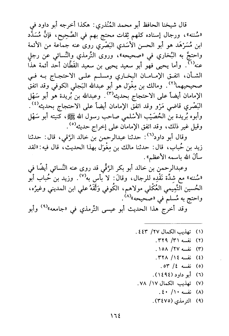قَالَ شَيْخُنَا الْحَافِظُ أَبُو مُحَمَّدٍ الْمُنْذِرِيُّ: هَكَذَا أَخْرَجَهُ أَبُو دَاوُدَ فِي ((سُنَنِهِ)) ، وَرِجَالُ إِسْنَادِهِ كُلُّهُمْ ثِقَاتٌ مُحْتَجٌّ بِهِمْ فِي الصَّحِيحِ، فَإِنَّ مسدد ابن مُسَرْهَدٍ هُوَ أَبُو الْحَسَنِ الأَسَدِيُّ الْبَصْرِيُّ رَوَى عَنْهُ جَمَاعَةٌ مِنَ الأَئِمَّةِ وَاحْتَجَّ بِهِ الْبُخَارِيُّ فِي ((صَحِيحِهِ)) ، وَرَوَى التِّرْمِذِيِّ وَالنَّسَائِيُّ عَنْ رجلٍ عَنْهُ. وَأَمَّا يَحْيَى فَهُوَ أَبُو سَعِيدٍ يَحْيَى بْنُ سَعِيدٍ الْقَطَّانُ أَحَدُ أَئِمَّةُ هَذَا الشَّأْنِ، اتَّفَقَ الإِمَامَانِ الْبُخَارِيُّ وَمُسْلِمٌ عَلَى الاحْتِجَاجِ بِهِ فِي صَحِيحَيْهِمَا. وَمَالِكُ بْنُ مِغْوَلٍ هُوَ أَبُو عَبْدِ اللَّهِ الْبَجَلِيُّ الْكُوفِيُّ وَقَدْ اتَّفَقَ الإِمَامَانِ أَيْضًا عَلَى الاحْتِجَاجِ بِحَدِيثِهِ. وَعَبْدُ اللَّهِ بْنُ بُرَيْدَةَ هُوَ أَبُو سَهْلٍ الْبَصْرِيُّ قَاضِي مَرْوَ وَقَدْ اتَّفَقَ الإِمَامَانِ أَيْضًا عَلَى الاحْتِجَاجِ بِحَدِيثِهِ. وأبوه بُرَيْدَةَ بْنُ الْحَصِيبِ الأَسْلَمِيُّ صَاحِبُ رَسُولِ اللَّهِ صَلَّى اللَّهُ عَلَيْهِ وَسَلَّمَ، كُنْيَتُهُ أَبُو سَهْلٍ وَقِيلَ غَيْرُ ذَلِكَ، وَقَدِ اتَّفَقَ الإِمَامَان عَلَى إِخْرَاجِ حَدِيثِهِ.