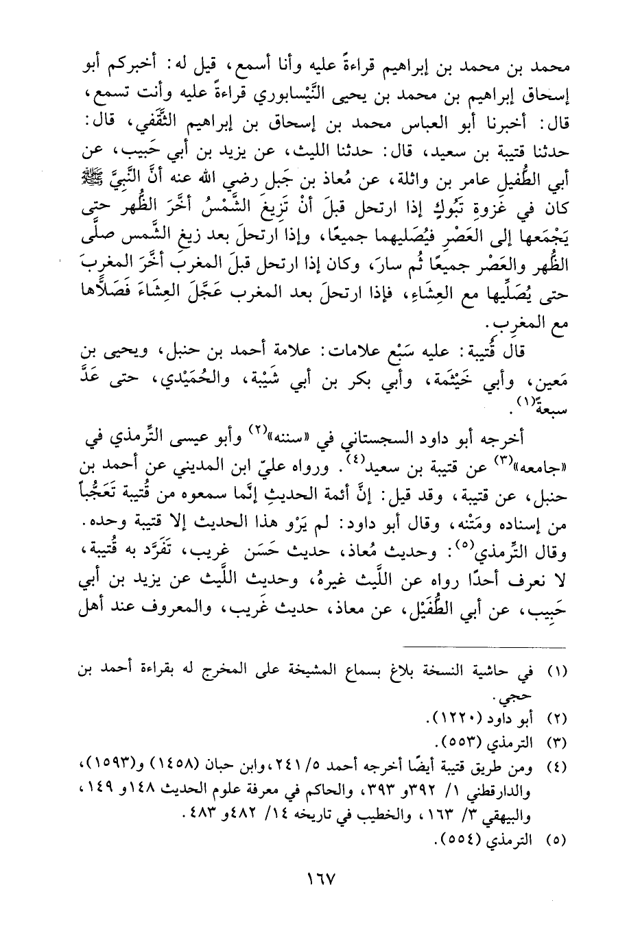 مُحَمَّدُ بْنُ مُحَمَّدِ بْنِ إِبْرَاهِيمَ قِرَاءَةً عَلَيْهِ وَأَنَا أَسْمَعُ، قِيلَ لَهُ: أَخْبَرَكُمْ أَبُو إِسْحَاقَ إِبْرَاهِيمُ بْنُ مُحَمَّدِ بْنِ يَحْيَى النَّيْسَابُورِيُّ قِرَاءَةً عَلَيْهِ وَأَنْتَ تَسْمَعُ، قَالَ: أَخْبَرَنَا أَبُو الْعَبَّاسِ مُحَمَّدُ بْنُ إِسْحَاقَ بْنِ إِبْرَاهِيمَ الثَّقَفِيُّ، قَالَ: حَدَّثَنَا قُتَيْبَةُ بْنُ سَعِيدٍ، قَالَ: حَدَّثَنَا اللَّيْثُ، عَنْ يَزِيدَ بْنِ أَبِي حَبِيبٍ، عَنْ أَبِي الطُّفَيْلِ عَامِرِ بْنِ وَاثِلَةَ، عَنْ مُعَاذِ بْنِ جَبَلٍ رَضِيَ اللَّهُ عَنْهُ أَنَّ النَّبِيَّ صَلَّى اللَّهُ عَلَيْهِ وَسَلَّمَ كَانَ فِي غَزْوَةِ تَبُوكَ إِذَا ارْتَحَلَ قَبْلَ أَنْ تَزِيغَ الشَّمْسُ أَخَّرَ الظُّهْرَ حَتَّى يَجْمَعَهَا إِلَى الْعَصْرِ فَيُصَلِّيَهُمَا جَمِيعًا، وَإِذَا ارْتَحَلَ بَعْدَ زَيْغِ الشَّمْسِ صَلَّى الظُّهْرَ وَالْعَصْرَ جَمِيعًا ثُمَّ سَارَ، وَكَانَ إِذَا ارْتَحَلَ قَبْلَ الْمَغْرِبِ أَخَّرَ الْمَغْرِبَ حَتَّى يُصَلِّيَهَا مَعَ الْعِشَاءِ، فَإِذَا ارْتَحَلَ بَعْدَ الْمَغْرِبِ عَجَّلَ الْعِشَاءَ فَصَلاهَا مَعَ الْمَغْرِبِ.