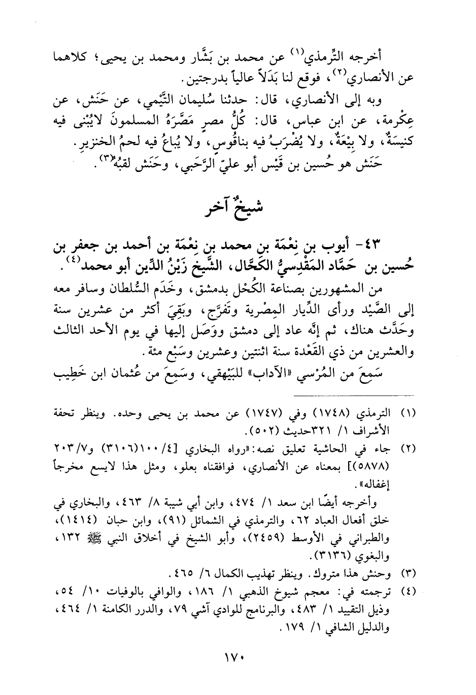 43- أَيُّوبُ بْنُ نِعْمَةَ بْنِ مُحَمَّدِ بْنِ نِعْمَةَ بْنِ أَحْمَدَ بْنِ جَعْفَرِ بْنِ حُسَيْنِ بْنِ حَمَّادٍ الْمَقْدِسِيُّ الْكَحَّالُ، الشَّيْخُ زَيْنُ الدِّينِ أَبُو مُحَمَّدٍ.