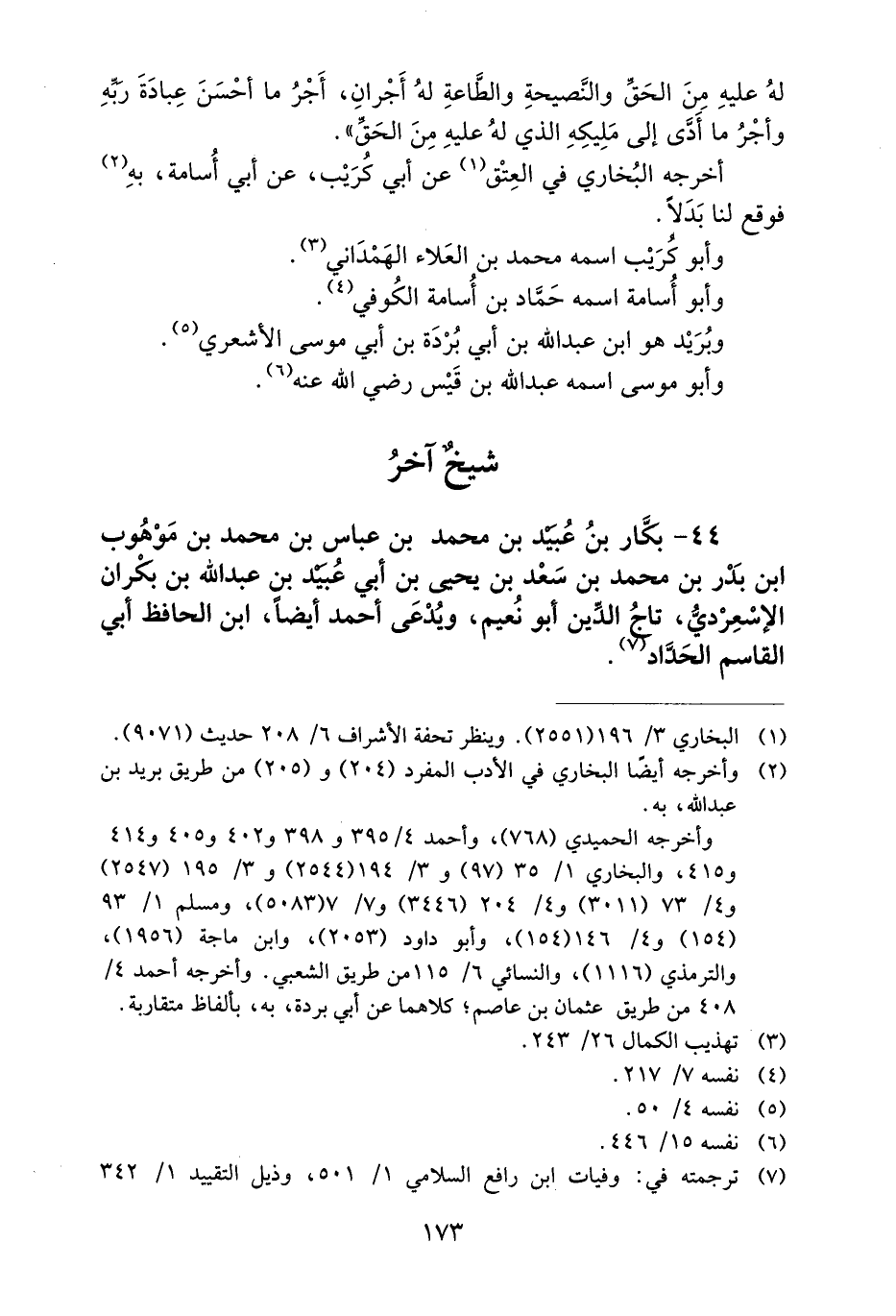 44- بَكَّارُ بْنُ عُبَيْدِ بْنِ مُحَمَّدِ بْنِ عَبَّاسِ بْنِ مُحَمَّدِ بْنِ مَوْهُوبِ بْنِ بَدْرِ بْنِ مُحَمَّدِ بْنِ سَعْدِ بْنِ يَحْيَى بْنِ أَبِي عُبَيْدِ بْنِ عَبْدِ اللَّهِ بْنِ بَكْرَانَ الإِسْعَرْدِيُّ، تَاجُ الدِّينِ أبو نعيم، ويدعى أحمد أيضاً، ابن الْحَافِظِ أَبِي الْقَاسِمِ الْحَدَّادُ.