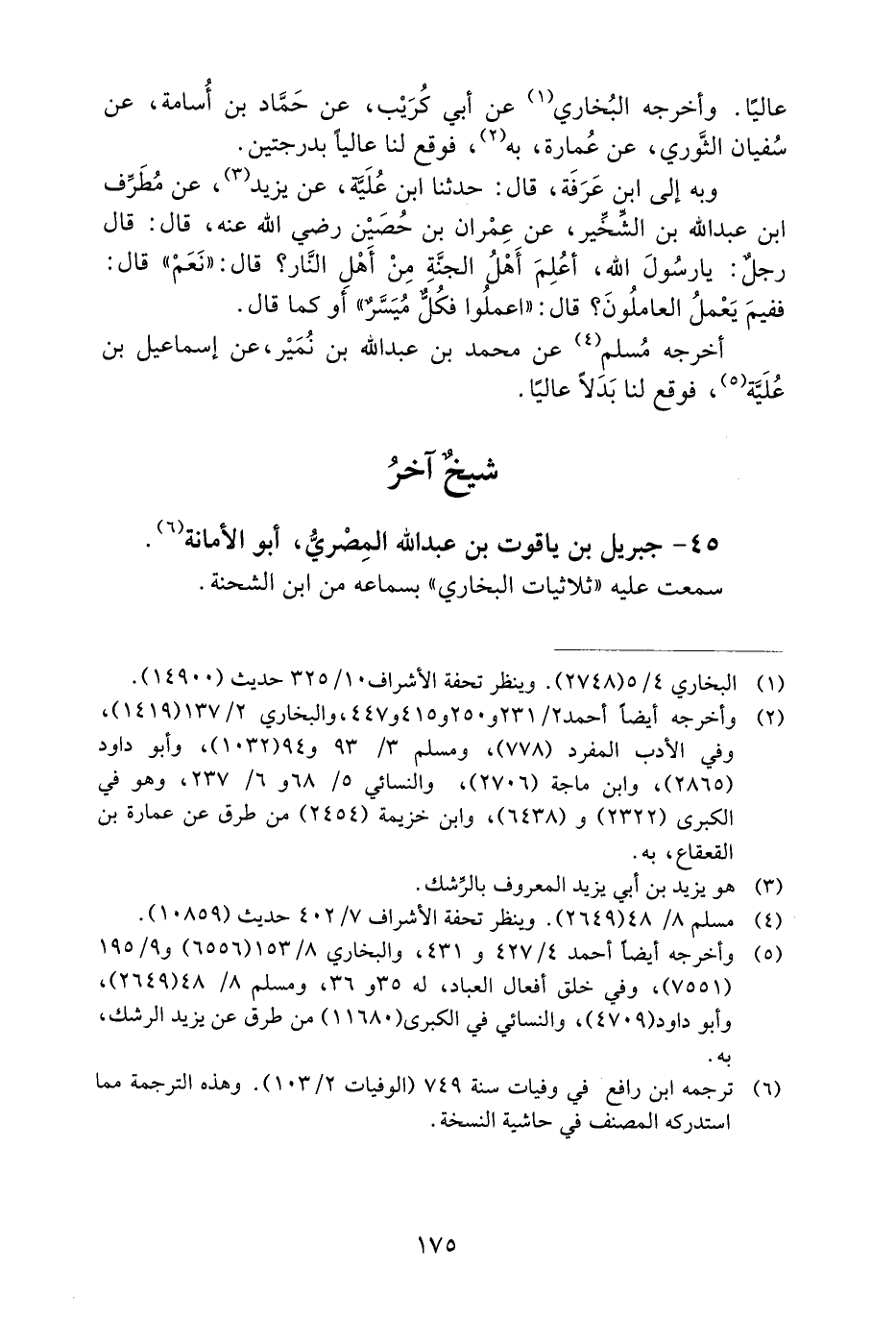 عَالِيًا. وَأَخْرَجَهُ الْبُخَارِيُّ عَنْ أَبِي كُرَيْبٍ، عَنْ حَمَّادِ بْنِ أُسَامَةَ، عَنْ سُفْيَانَ الثَّوْرِيِّ، عَنْ عُمَارَةَ، بِهِ، فَوَقَعَ لَنَا عَالِيًا بِدَرَجَتَيْنِ.