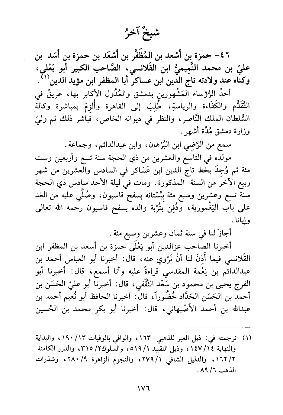 46- حَمْزَةُ بْنُ أَسْعَدَ بْنِ الْمُظَفَّرِ بْنِ أَسْعَدَ بْنِ حَمْزَةَ بْنِ أَسَدِ بْنِ عَلِيِّ بْنِ مُحَمَّدٍ التَّمِيمِيِّ ابْنُ الْقَلانِسِيِّ، الصَّاحِبُ الْكَبِيرُ أَبُو يَعْلَى، وَكَنَّاهُ عِنْدَ وِلادَتِهِ تَاجَ الدِّينِ ابْنَ عَسَاكِرَ أَبَا الْمُظَفَّرِ ابْنَ مُؤَيَّدِ الدِّينِ.