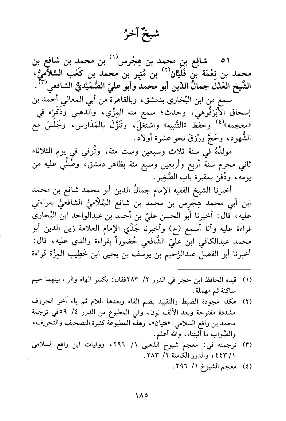51- شَافِعُ بْنُ مُحَمَّدِ بْنِ هَجْرَسِ بْنِ مُحَمَّدِ بْنِ شَافِعِ بْنِ مُحَمَّدِ بْنِ نِعْمَةَ بْنِ فَلْيَانَ بْنِ مُنِيرِ بْنِ مُحَمَّدِ بْنِ كَعْبٍ السَّلامِيُّ، الشَّيْخُ الْعَدْلُ جَمَالُ الدِّينِ أَبُو مُحَمَّدٍ وَأَبُو عَلِيٍّ الصُّمَيْدِيُّ الشَّافِعِيُّ.