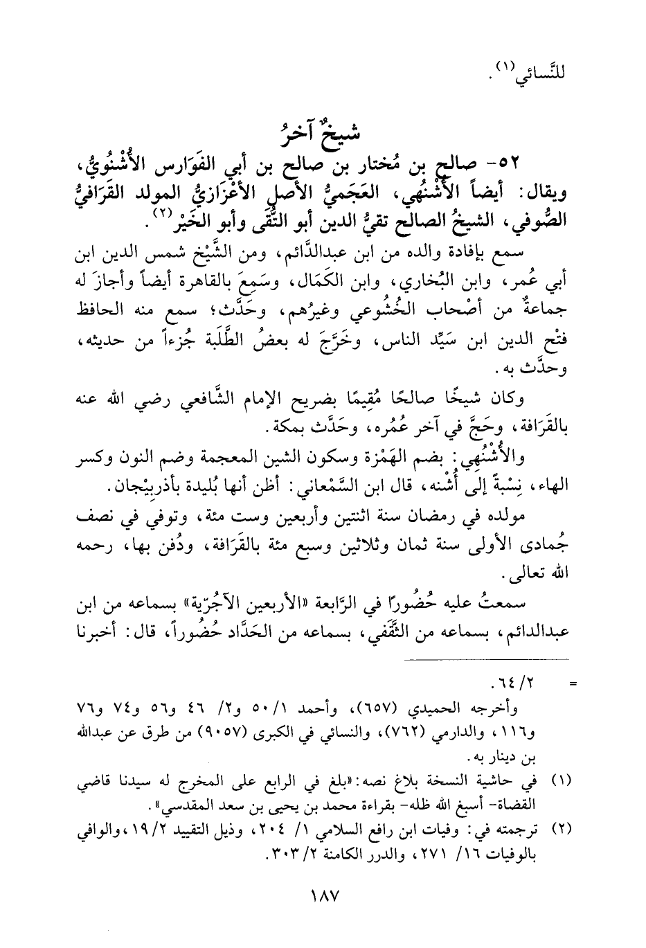 52- صَالِحُ بْنُ مُخْتَارِ بْنِ صَالِحِ بْنِ أَبِي الْفَوَارِسِ الأُشْنُوِيُّ، وَيُقَالُ: أَيْضًا الأُشْنُهِيُّ، الْعَجَمِيُّ الأَصْلِ الأَعْزَازِيُّ الْمَوْلِدِ الْقَرَافِيُّ الصُّوفِيُّ، الشَّيْخُ الصَّالِحُ تَقِيُّ الدِّينِ أَبُو التُّقَى وَأَبُو الْخَيْرِ.
