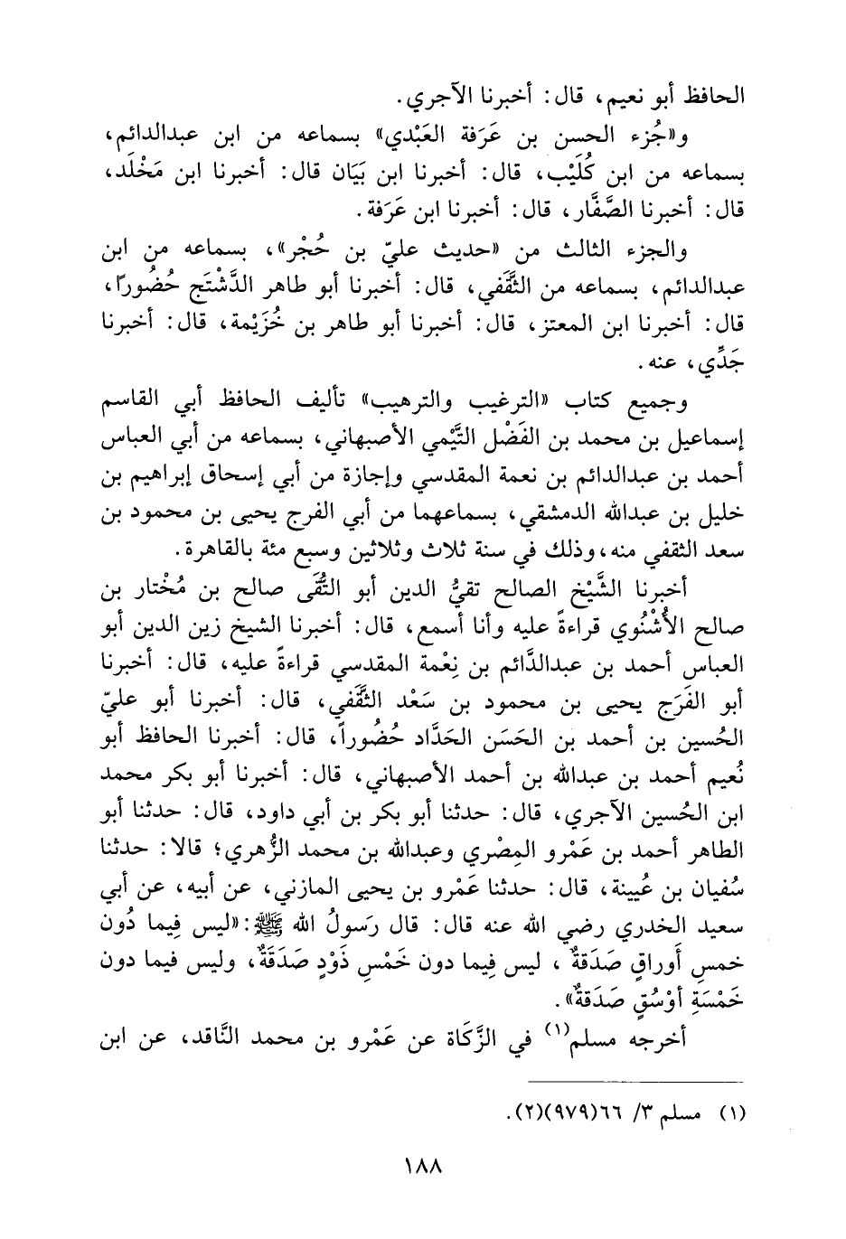 أَخْبَرَنَا الشَّيْخُ الصَّالِحُ تَقِيُّ الدِّينِ أَبُو التُّقَى صَالِحُ بْنُ مُخْتَارِ بْنِ صَالِحٍ الأُشْنُوِيُّ قِرَاءَةً عَلَيْهِ وَأَنَا أَسْمَعُ، قَالَ: أَخْبَرَنَا الشَّيْخُ زَيْنُ الدِّينِ أَبُو الْعَبَّاسِ أَحْمَدُ بْنُ عَبْدِ الدَّائِمِ بْنِ نِعْمَةَ الْمَقْدِسِيُّ قِرَاءَةً عَلَيْهِ، قَالَ: أَخْبَرَنَا أَبُو الْفَرَجِ يَحْيَى بْنُ مَحْمُودِ بْنِ سَعْدٍ الثَّقَفِيُّ، قَالَ: أَخْبَرَنَا أَبُو عَلِيٍّ الْحُسَيْنُ بْنُ أَحْمَدَ بْنِ الْحَسَنِ الْحَدَّادُ حُضُورًا، قَالَ: أَخْبَرَنَا الْحَافِظُ أَبُو نُعَيْمٍ أَحْمَدُ بْنُ عَبْدِ اللَّهِ بْنِ أَحْمَدَ الأَصْبَهَانِيُّ، قَالَ: أَخْبَرَنَا أَبُو بَكْرٍ مُحَمَّدُ بْنُ الْحُسَيْنِ الآجُرِّيُّ، قَالَ: حَدَّثَنَا أَبُو بَكْرِ بْنُ أَبِي دَاوُدَ، قَالَ: حَدَّثَنَا أَبُو الطَّاهِرِ أَحْمَدُ بْنُ عَمْرٍو الْمِصْرِيُّ وَعَبْدُ اللَّهِ بْنُ مُحَمَّدٍ الزُّهْرِيُّ؛ قَالا: حَدَّثَنَا سُفْيَانُ بْنُ عُيَيْنَةَ، قَالَ: حَدَّثَنَا عَمْرُو بْنُ يَحْيَى الْمَازِنِيُّ، عَنْ أَبِيهِ، عَنْ أَبِي سَعِيدٍ الْخُدْرِيِّ رَضِيَ اللَّهُ عَنْهُ قَالَ: قَالَ رَسُولُ اللَّهِ صَلَّى اللَّهُ عَلَيْهِ وَسَلَّمَ: ((لَيْسَ فِيمَا دُونَ خَمْسِ أوراقٍ صدقةٌ، لَيْسَ فِيمَا دُونَ خَمْسِ ذودٍ صدقةٌ، وَلَيْسَ فِيمَا دُونَ خَمْسَةِ أوسقٍ صدقةٌ)) .