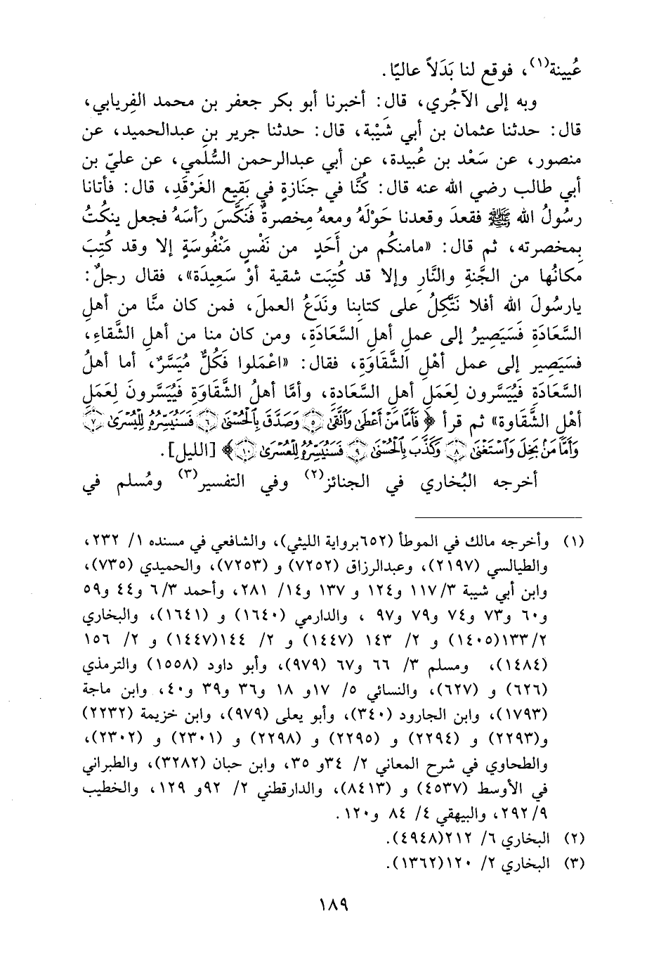 وَبِهِ إِلَى الآجُرِّيِّ، قَالَ: أَخْبَرَنَا أَبُو بَكْرٍ جَعْفَرُ بْنُ مُحَمَّدٍ الْفِرْيَابِيُّ، قَالَ: حَدَّثَنَا عُثْمَانُ بْنُ أَبِي شَيْبَةَ، قَالَ: حَدَّثَنَا جَرِيرُ بْنُ عَبْدِ الْحَمِيدِ، عَنْ مَنْصُورٍ، عَنْ سَعْدِ بْنِ عُبَيْدَةَ، عَنْ أَبِي عَبْدِ الرَّحْمَنِ السُّلَمِيِّ، عَنْ عَلِيِّ بْنِ أَبِي طَالِبٍ رَضِيَ اللَّهُ عَنْهُ قَالَ: كُنَّا فِي جنازةٍ فِي بَقِيعِ الْغَرْقَدِ، قَالَ: فَأَتَانَا رَسُولُ اللَّهِ صَلَّى اللَّهُ عَلَيْهِ وَسَلَّمَ فَقَعَدَ وَقَعَدْنَا حَوْلَهُ وَمَعَهُ مِخْصَرَةٌ فَنَكَّسَ رَأْسَهُ فَجَعَلَ يَنْكُتُ بِمِخْصَرَتِهِ، ثُمَّ قَالَ: ((مَا مِنْكُمْ مِنْ أحدٍ مِنْ نَفْسٍ منفوسةٍ إِلا وَقَدْ كُتِبَ مَكَانُهَا مِنَ الْجَنَّةِ وَالنَّارِ وَإِلا قَدْ كُتِبَتْ شَقِيَّةٌ أَوْ سَعِيدَةٌ)) ، فَقَالَ رجلٌ: يَا رَسُولَ اللَّهِ أَفَلا نَتَّكِلُ عَلَى كِتَابِنَا وَنَدَعُ الْعَمَلَ، فَمَنْ كَانَ مِنَّا مِنْ أَهْلِ السَّعَادَةِ فَسَيَصِيرُ إِلَى عَمَلِ أَهْلِ السَّعَادَةِ، وَمَنْ كَانَ مِنَّا مِنْ أَهْلِ الشَّقَاءِ، فَسَيَصِيرُ إِلَى عَمَلِ أَهْلِ الشَّقَاوَةِ، فَقَالَ: ((اعْمَلُوا فَكُلٌّ ميسرٌ، أَمَّا أَهْلُ السَّعَادَةِ فَيُيَسَّرُونَ لِعَمَلِ أَهْلِ السَّعَادَةِ، وَأَمَّا أَهْلُ الشَّقَاوَةِ فَيُيَسُّرُونَ لِعَمَلِ أَهْلِ الشَّقَاوَةِ)) ثُمَّ قَرَأَ: {فَأَمَّا مَنْ أَعْطَى وَاتَّقَى. وَصَدَّقَ بِالْحُسْنَى. فَسَنُيَسِّرُهُ لِلْيُسْرَى. وَأَمَّا مَنْ بَخِلَ وَاسْتَغْنَى. وَكَذَّبَ بِالْحُسْنَى. فسنيسره للعسرى} .
