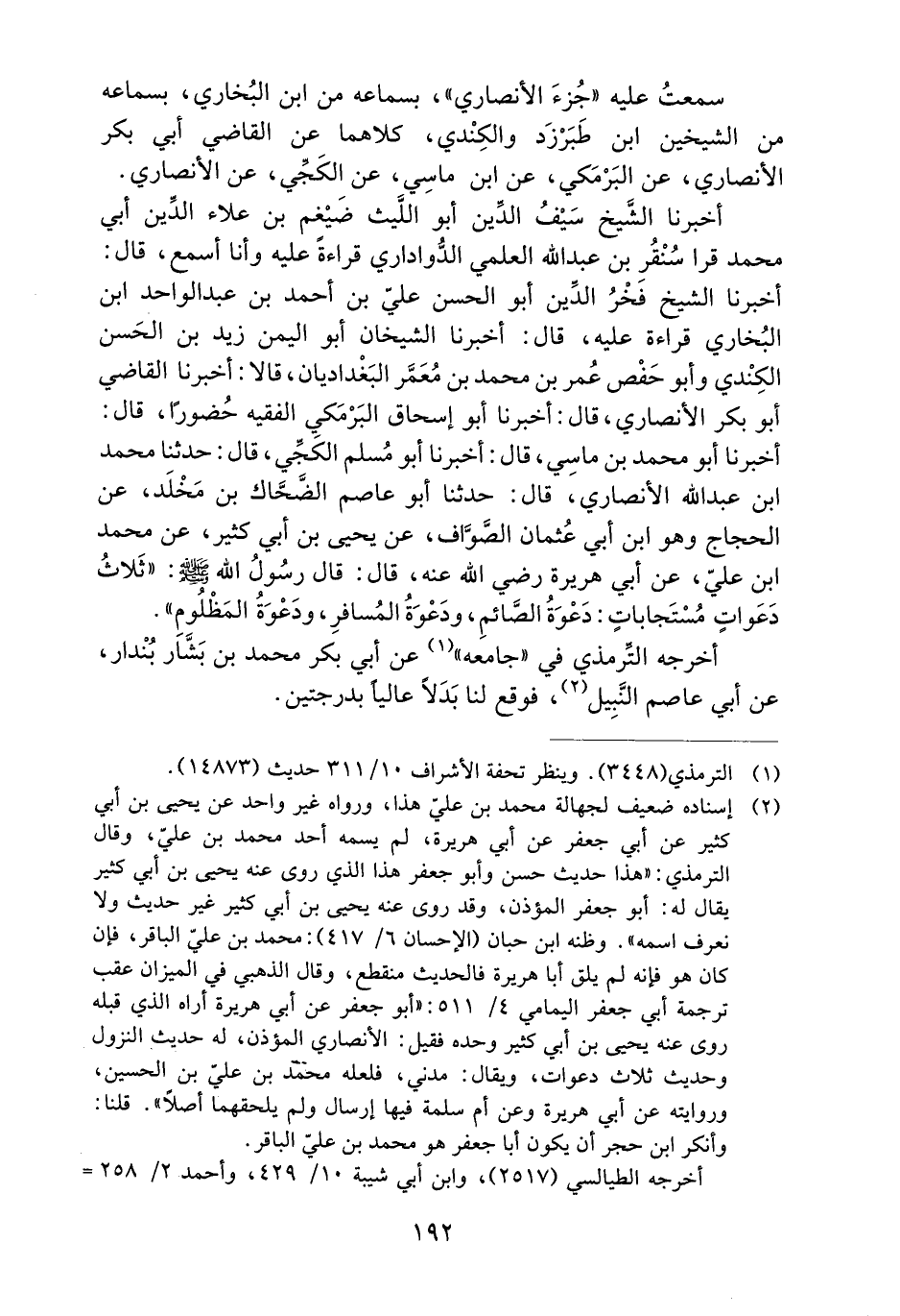 أَخْبَرَنَا الشَّيْخُ سَيْفُ الدِّينِ أَبُو اللَّيْثِ ضَيْغَمُ بْنُ عَلاءِ الدِّينِ أَبِي مُحَمَّدٍ قِرَا سُنْقُرَ بْنِ عَبْدِ اللَّهِ الْعَلَمِيُّ الدَّوَادَارِيُّ قِرَاءَةً عَلَيْهِ وَأَنَا أَسْمَعُ، قَالَ: أَخْبَرَنَا الشَّيْخُ فَخْرُ الدِّينِ أَبُو الْحَسَنِ عَلِيُّ بْنُ أَحْمَدَ بْنِ عَبْدِ الْوَاحِدِ ابْنُ الْبُخَارِيِّ قِرَاءَةً عَلَيْهِ، قَالَ: أَخْبَرَنَا الشَّيْخَانِ أَبُو الْيُمْنِ زَيْدُ بْنُ الْحَسَنِ الْكِنْدِيُّ وَأَبُو حَفْصٍ عُمَرُ بْنُ مُحَمَّدِ بْنِ مَعْمَرٍ الْبَغْدَادِيَّانِ، قَالا: أَخْبَرَنَا الْقَاضِي أَبُو بَكْرٍ الأَنْصَارِيُّ، قَالَ: أَخْبَرَنَا أَبُو إِسْحَاقَ الْبَرْمَكِيُّ الْفَقِيهُ حُضُورًا، قَالَ: أَخْبَرَنَا أَبُو مُحَمَّدِ بْنُ مَاسِيٍّ، قَالَ: أَخْبَرَنَا أَبُو مُسْلِمٍ الْكَجِّيُّ، قَالَ: حَدَّثَنَا محمد ابن عَبْدِ اللَّهِ الأَنْصَارِيُّ، قَالَ: حَدَّثَنَا أَبُو عَاصِمٍ الضَّحَّاكُ بْنُ مَخْلَدٍ، عَنِ الْحَجَّاجِ وَهُوَ ابْنُ أَبِي عُثْمَانَ الصَّوَّافُ، عَنْ يَحْيَى بْنِ أَبِي كَثِيرٍ، عَنْ مُحَمَّدِ بْنِ عَلِيٍّ، عَنْ أَبِي هُرَيْرَةَ رَضِيَ اللَّهُ عَنْهُ، قَالَ: قَالَ رَسُولُ اللَّهِ صَلَّى اللَّهُ عَلَيْهِ وَسَلَّمَ: ((ثَلاثُ دعواتٍ مستجاباتٍ: دَعْوَةُ الصَّائِمِ، وَدَعْوَةُ الْمُسَافِرِ، وَدَعْوَةُ الْمَظْلُومِ)) .