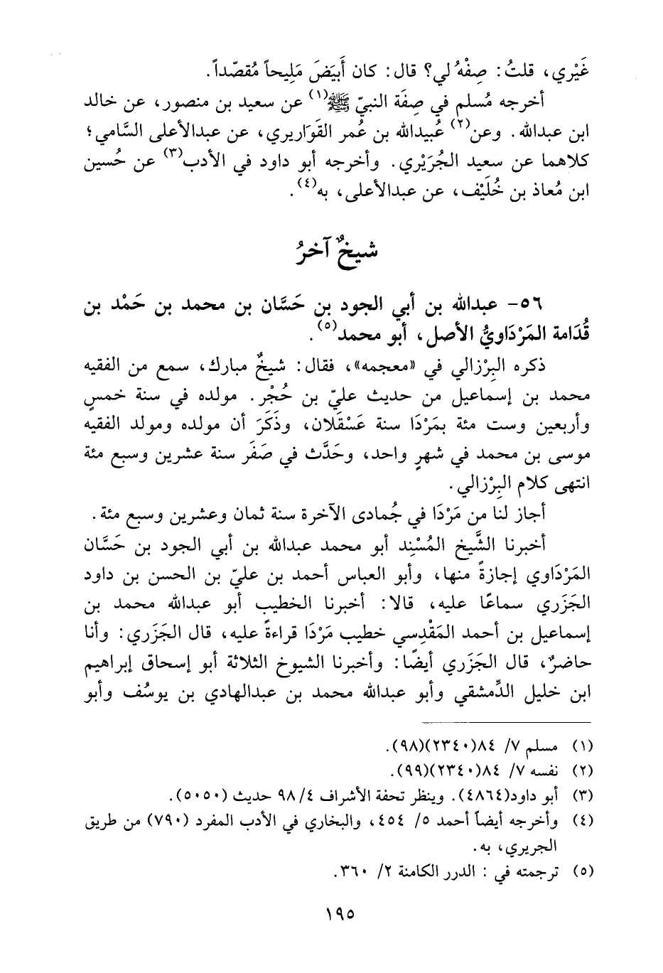 أَخْرَجَهُ مُسْلِمٌ فِي صِفَةِ النَّبِيِّ صَلَّى اللَّهُ عَلَيْهِ وَسَلَّمَ عَنْ سَعِيدِ بْنِ منصور، عن خالد ابن عَبْدِ اللَّهِ. وَعَنْ عُبَيْدِ اللَّهِ بْنِ عُمَرَ الْقَوَارِيرِيِّ، عَنْ عَبْدِ الأَعْلَى السَّامِيِّ؛ كِلاهُمَا عَنْ سَعِيدٍ الْجَرِيرِيِّ. وَأَخْرَجَهُ أَبُو دَاوُدَ فِي الأَدَبِ عن حسين ابن مُعَاذِ بْنِ خُلَيْفٍ، عَنْ عَبْدِ الأَعْلَى، بِهِ.