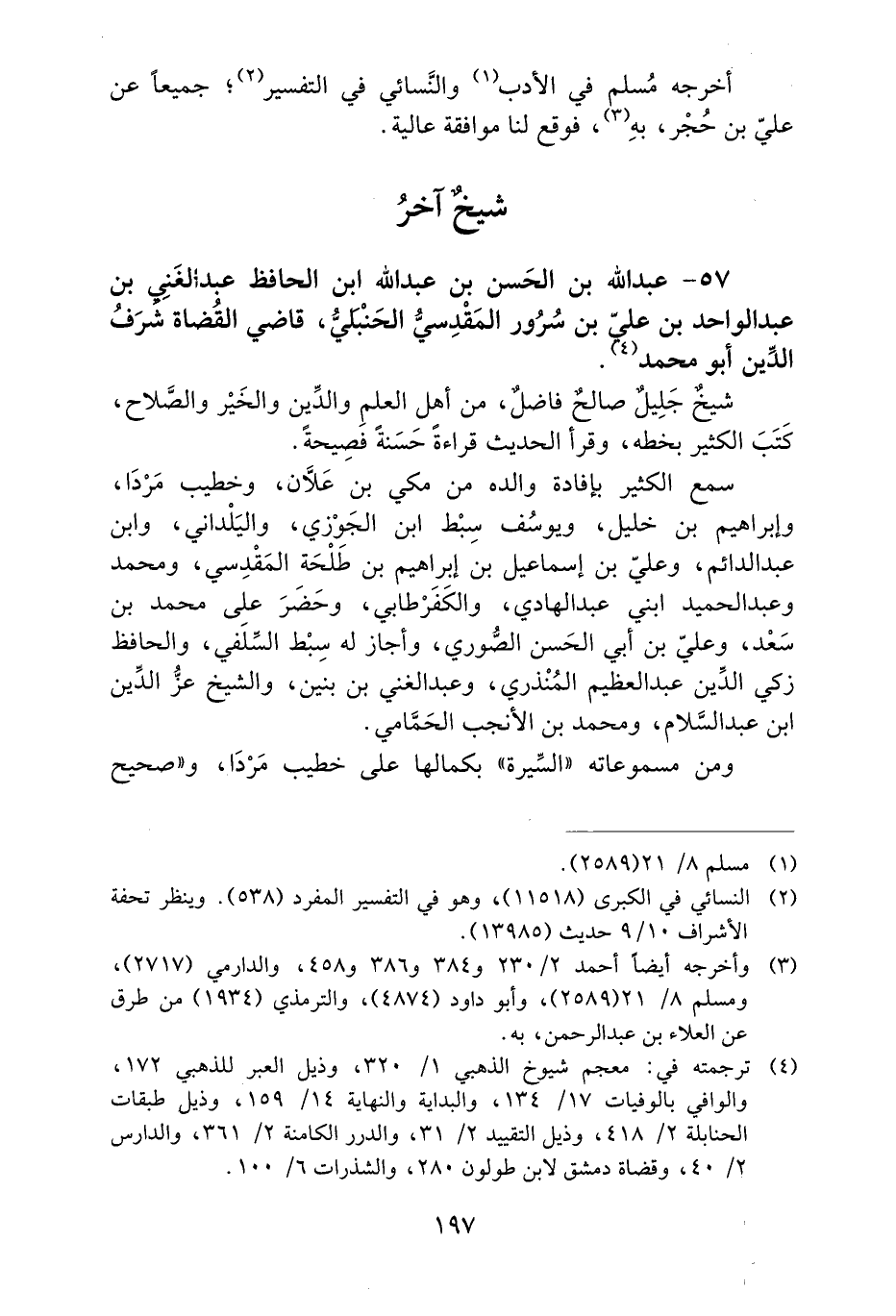 57- عَبْدُ اللَّهِ بْنُ الْحَسَنِ بْنِ عَبْدِ اللَّهِ ابْنِ الْحَافِظِ عَبْدِ الْغَنِيِّ بْنِ عَبْدِ الْوَاحِدِ بْنِ عَلِيِّ بْنِ سُرُورٍ الْمَقْدِسِيُّ الْحَنْبَلِيُّ، قَاضِي الْقُضَاةِ شَرَفُ الدِّينِ أَبُو مُحَمَّدٍ.