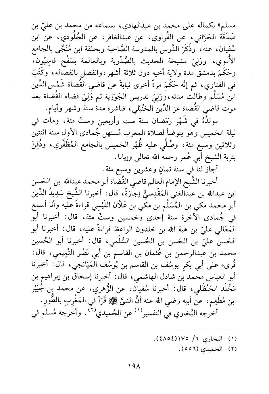 أَخْبَرَنَا الشَّيْخُ الإِمَامُ الْعَالِمُ قَاضِي الْقُضَاةِ أَبُو محمد عبد الله بن الحسن ابن عَبْدِ اللَّهِ بْنِ عَبْدِ الْغَنِيِّ الْمَقْدِسِيُّ إِجَازَةً، قَالَ: أَخْبَرَنَا الشَّيْخُ سَدِيدُ الدِّينِ أَبُو مُحَمَّدٍ مَكِّيُّ بْنُ الْمُسْلِمِ بْنِ مَكِّيِّ بْنِ عَلانَ الْقَيْسِيُّ قِرَاءَةً عَلَيْهِ وَأَنَا أَسْمَعُ فِي جُمَادَى الآخرة سنة إحدى وخمسين وست مئة، قَالَ: أَخْبَرَنَا أَبُو الْمَعَالِي عَلِيُّ بْنُ هِبَةِ اللَّهِ بْنِ خَلْدُونَ الْوَاعِظُ قِرَاءَةً عَلَيْهِ، قَالَ: أَخْبَرَنَا أَبُو الْحَسَنِ عَلِيُّ بْنُ الْحَسَنِ بْنِ الْحُسَيْنِ السُّلَمِيُّ، قَالَ: أَخْبَرَنَا أَبُو الْحُسَيْنِ مُحَمَّدُ بْنُ عَبْدِ الرَّحْمَنِ بْنِ عُثْمَانَ بْنِ الْقَاسِمِ بْنِ أَبِي نَصْرٍ التَّمِيمِيُّ، قَالَ: قُرِئَ عَلَى أَبِي بكرٍ يُوسُفَ بْنِ الْقَاسِمِ بْنِ يُوسُفَ الْمَيَانَجِيِّ، قَالَ: أَخْبَرَنَا أَبُو الْعَبَّاسِ مُحَمَّدُ بْنُ شَادِلٍ الْهَاشِمِيُّ، قَالَ: أَخْبَرَنَا إِسْحَاقُ بْنُ إِبْرَاهِيمَ بْنِ مَخْلَدٍ الْحَنْظَلِيُّ، قَالَ: أَخْبَرَنَا سُفْيَانُ، عَنِ الزهري، عن محمد بن جبير ابن مُطْعِمٍ، عَنْ أَبِيهِ رَضِيَ اللَّهُ عَنْهُ أَنَّ النَّبِيَّ صَلَّى اللَّهُ عَلَيْهِ وَسَلَّمَ قَرَأَ فِي الْمَغْرِبِ بِالطُّورِ.