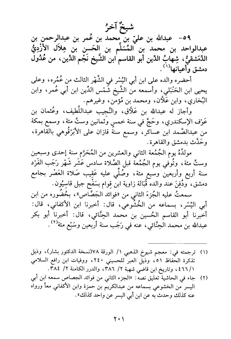 59- عَبْدُ اللَّهِ بْنُ عَلِيِّ بْنِ مُحَمَّدِ بْنِ عُمَرَ بْنِ عَبْدِ الرَّحْمَنِ بْنِ عَبْدِ الْوَاحِدِ بْنِ مُحَمَّدِ بْنِ الْمُسْلِمِ بْنِ الْحَسَنِ بْنِ هِلالٍ الأَزْدِيُّ الدِّمَشْقِيُّ، شِهَابُ الدِّينِ أبو القاسم ابن الشَّيْخِ نَجْمِ الدِّينِ، مِنْ عُدُولِ دِمَشْقَ وَأَعْيَانِهَا.