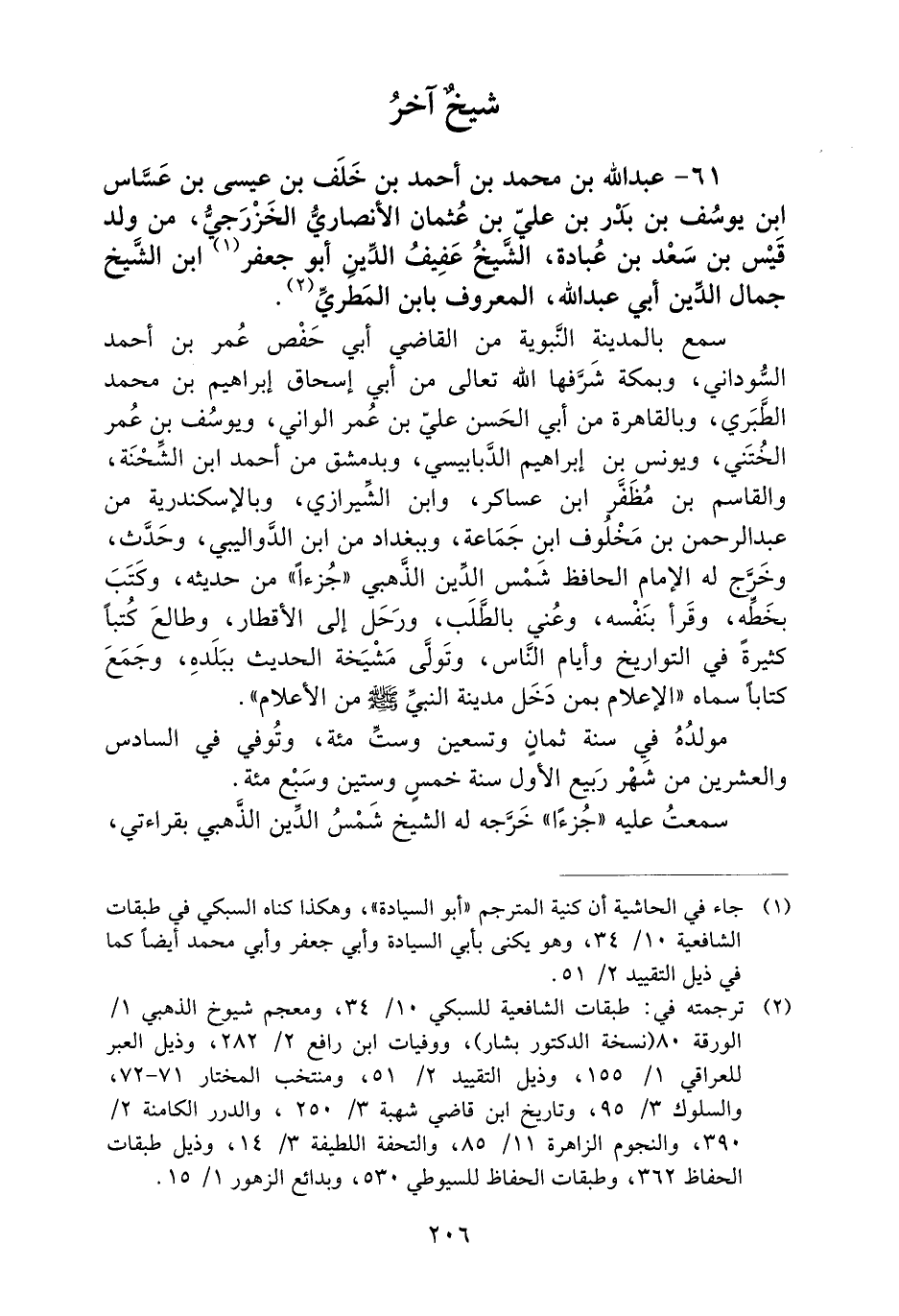 61- عَبْدُ اللَّهِ بْنُ مُحَمَّدِ بْنِ أَحْمَدَ بْنِ خَلَفِ بْنِ عِيسَى بْنِ عَسَّاسِ ابن يُوسُفَ بْنِ بَدْرِ بْنِ عَلِيِّ بْنِ عُثْمَانَ الأَنْصَارِيُّ الْخَزْرَجِيُّ، مِنْ وَلَدِ قَيْسِ بْنِ سَعْدِ بْنِ عُبَادَةَ، الشَّيْخُ عَفِيفُ الدِّينِ أَبُو جَعْفَرِ ابْنُ الشَّيْخِ جَمَالِ الدِّينِ أَبِي عَبْدِ اللَّهِ، الْمَعْرُوفُ بِابْنِ الْمَطَرِيِّ.