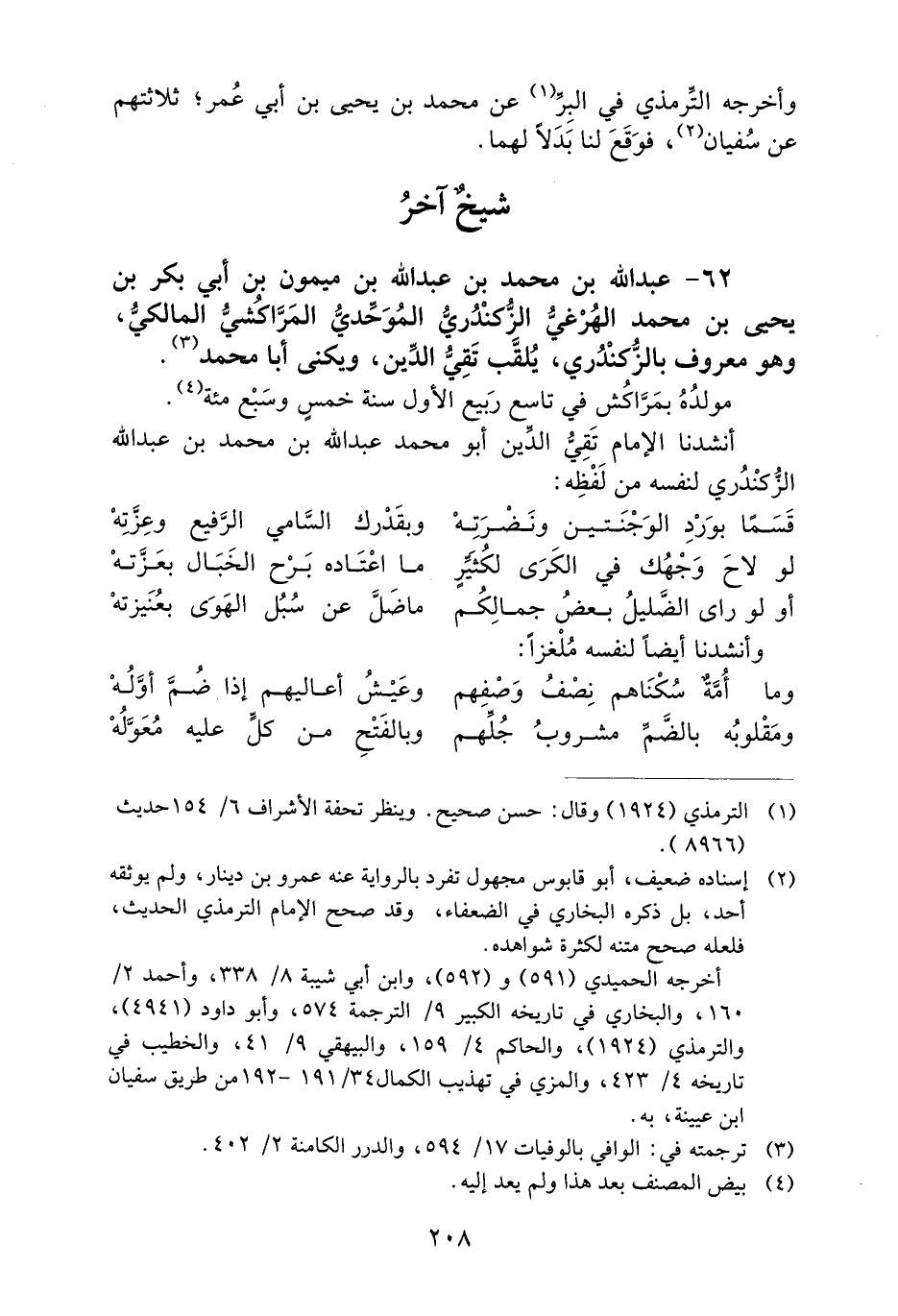 62- عَبْدُ اللَّهِ بْنِ مُحَمَّدِ بْنِ عَبْدِ اللَّهِ بْنِ مَيْمُونِ بْنِ أَبِي بَكْرِ بْنِ يَحْيَى بْنِ محمد الْهرغِيِّ الزَّكَنْدَرِيُّ الْمُوَحِّدِيُّ الْمَرَاكِشِيُّ الْمَالِكِيُّ، وَهُوَ مَعْرُوفٌ بِالزّكندرِيِّ، يُلَقَّبُ تَقِيُّ الدِّينِ، وَيُكْنَى أَبَا مُحَمَّدٍ.