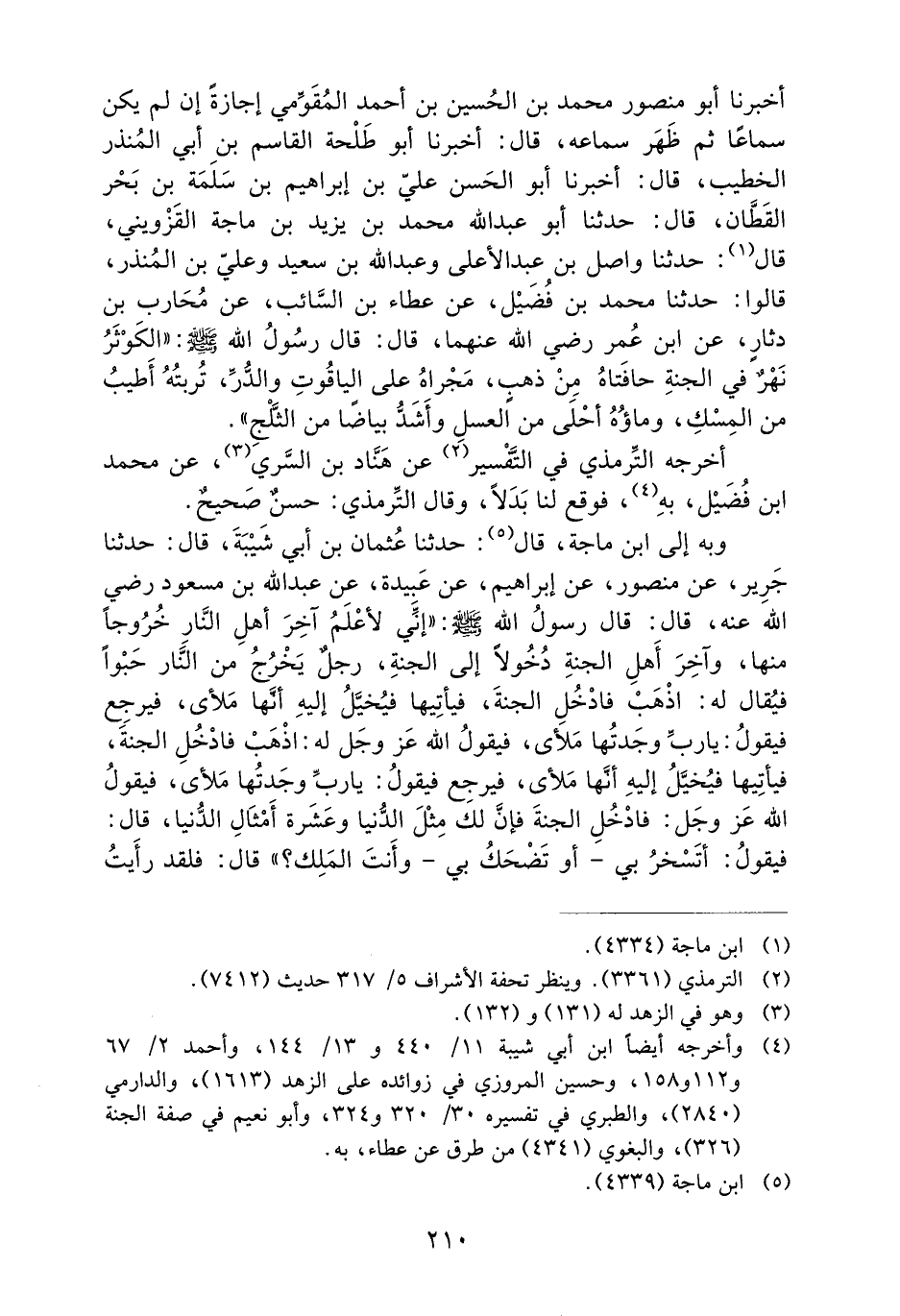 وَبِهِ إِلَى ابْنِ مَاجَهْ، قَالَ: حَدَّثَنَا عُثْمَانُ بْنُ أَبِي شَيْبَةَ، قَالَ: حَدَّثَنَا جَرِيرٌ، عَنْ مَنْصُورٍ، عَنْ إِبْرَاهِيمَ، عَنْ عُبَيْدَةَ، عَنْ عَبْدِ اللَّهِ بْنِ مَسْعُودٍ رَضِيَ اللَّهُ عَنْهُ، قَالَ: قَالَ رَسُولُ اللَّهِ صَلَّى اللَّهُ عَلَيْهِ وَسَلَّمَ: ((إِنِّي لأَعْلَمُ آخِرَ أَهْلِ النَّارِ خُرُوجًا مِنْهَا، وَآخِرَ أَهْلِ الْجَنَّةِ دُخُولا إِلَى الْجَنَّةِ، رجلٌ يَخْرُجُ مِنَ النَّارِ حَبْوًا فَيُقَالُ لَهُ: اذْهَبْ فَادْخُلِ الْجَنَّةَ، فَيَأْتِيهَا فَيُخَيَّلُ إِلَيْهِ أنها ملأى، فيرجع فيقول: يا رب وجدتها ملأى، فيقول الله عز وجل له: اذهب فادخل الجنة، فيأتيها فيخيل إليها أنها ملأى، فيرجع فيقول: يا رب وَجَدْتُهَا مَلأَى، فَيَقُولُ اللَّهُ عَزَّ وَجَلَّ: فَادْخُلِ الْجَنَّةَ فَإِنَّ لَكَ مِثْلَ الدُّنْيَا وَعَشَرَةَ أَمْثَالِ الدُّنْيَا، قَالَ: فَيَقُولُ: أَتَسْخَرُ بِي-أَوْ تَضْحَكُ بي- وأنت المكل؟)) قَالَ: فَلَقَدْ رَأَيْتُ