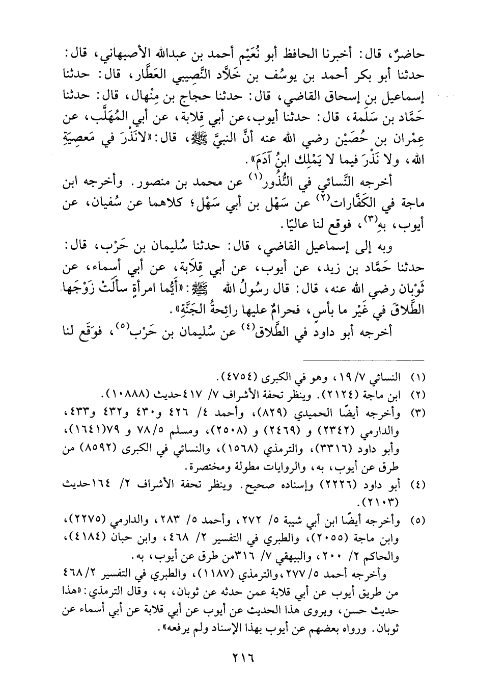 حاضرٌ، قَالَ: أَخْبَرَنَا الْحَافِظُ أَبُو نُعَيْمٍ أَحْمَدُ بْنُ عَبْدِ اللَّهِ الأَصْبَهَانِيُّ، قَالَ: حَدَّثَنَا أَبُو بَكْرٍ أَحْمَدُ بْنُ يُوسُفَ بْنِ خَلادٍ النَّصِيبِيُّ الْعَطَّارُ، قَالَ: حَدَّثَنَا إِسْمَاعِيلُ بْنُ إِسْحَاقَ الْقَاضِي، قَالَ: حَدَّثَنَا حَجَّاجُ بْنُ مِنْهَالٍ، قَالَ: حَدَّثَنَا حَمَّادُ بْنُ سَلَمَةَ، قَالَ: حَدَّثَنَا أَيُّوبُ، عَنْ أَبِي قِلابَةَ، عَنْ أَبِي الْمُهَلَّبِ، عَنْ عِمْرَانَ بْنِ حُصَيْنٍ رَضِيَ اللَّهُ عَنْهُ أَنَّ النَّبِيَّ صَلَّى اللَّهُ عَلَيْهِ وَسَلَّمَ، قَالَ: ((لا نَذْرَ فِي مَعْصِيَةِ اللَّهِ، وَلا نَذْرَ فِيمَا لا يَمْلِكُ ابْنُ آدَمَ)) .