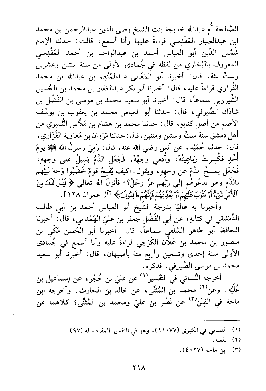 الصَّالِحَةُ أُمُّ عَبْدِ اللَّهِ خَدِيجَةُ بِنْتُ الشَّيْخِ رَضِيِّ الدِّينِ عَبْدِ الرَّحْمَنِ بْنِ مُحَمَّدِ بْنِ عَبْدِ الْجَبَّارِ الْمَقْدِسِيِّ قِرَاءَةً عَلَيْهِا وَأَنَا أَسْمَعُ، قَالَتْ: حَدَّثَنَا الإِمَامُ شَمْسُ الدِّينِ أَبُو الْعَبَّاسِ أَحْمَدُ بْنُ عَبْدِ الْوَاحِدِ بْنِ أَحْمَدَ الْمَقْدِسِيُّ الْمَعْرُوفُ بِالْبُخَارِيِّ مِنْ لَفْظِهِ فِي جُمَادَى الأُولَى من سنة اثنتين وعشرين وست مئة، قَالَ: أَخْبَرَنَا أَبُو الْمَعَالِي عَبْدُ الْمُنْعِمِ بْنُ عَبْدِ اللَّهِ بْنِ مُحَمَّدٍ الْفُرَاوِيُّ قِرَاءَةً عَلَيْهِ، قَالَ: أَخْبَرَنَا أَبُو بَكْرٍ عَبْدُ الْغَفَّارِ بْنُ مُحَمَّدِ بْنِ الْحُسَيْنِ الشِّيرُويِيُّ سَمَاعًا، قَالَ: أَخْبَرَنَا أَبُو سَعِيدٍ مُحَمَّدُ بْنُ مُوسَى بْنِ الْفَضْلِ بْنِ شَاذَانَ الصَّيْرَفِيُّ، قَالَ: حَدَّثَنَا أَبُو الْعَبَّاسِ مُحَمَّدُ بْنُ يَعْقُوبَ بْنِ يُوسُفَ الأَصَمُّ مِنْ أَصْلِ كِتَابِهِ، قَالَ: حَدَّثَنَا مُحَمَّدُ بْنُ هِشَامِ بْنِ مُلاسٍ النُّمَيْرِيُّ مِنْ أَهْلِ دِمَشْقَ سَنَةَ ست وستين ومئتين، قَالَ: حَدَّثَنَا مَرْوَانُ بْنُ مُعَاوِيَةَ الْفَزَارِيُّ، قَالَ: حَدَّثَنَا حُمَيْدٌ، عَنْ أَنَسٍ رَضِيَ اللَّهُ عَنْهُ، قَالَ: رُمِيَ رَسُولُ اللَّهِ صَلَّى اللَّهُ عَلَيْهِ وَسَلَّمَ يَوْمَ أحدٍ فَكُسِرَتْ رَبَاعِيَتُهُ، وَأُدْمِيَ وَجْهُهُ، فجعل الدم يسيل على وجهه، فجعل يسمح الدَّمَ عَنْ وَجْهِهِ، وَيَقُولُ: ((كَيْفَ يُفْلِحُ قومٌ خَضَبُوا وَجْهَ نَبِيِّهِمْ بِالدَّمِ وَهُوَ يَدْعُوهُمْ إِلَى رَبِّهِمْ عَزَّ وَجَلَّ؟)) فَأَنْزَلَ اللَّهُ تَعَالَى {لَيْسَ لَكَ مِنَ الأَمْرِ شيءٌ أَوْ يَتُوبَ عَلَيْهِمْ أَوْ يُعَذِّبُهُمْ فَإِنَّهُمْ ظَالِمُونَ} .