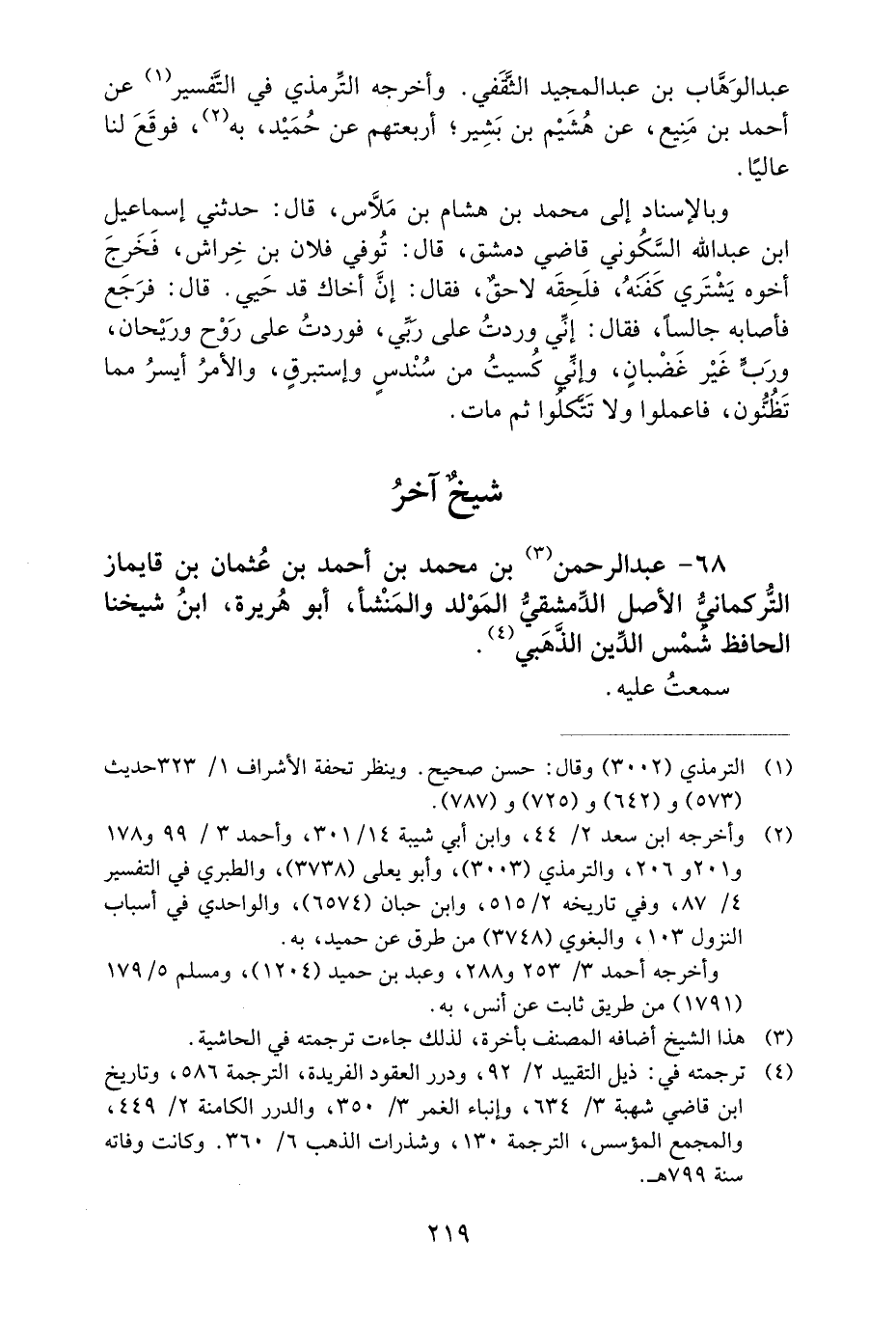 68- عَبْدُ الرَّحْمَنِ بْنُ مُحَمَّدِ بْنِ أَحْمَدَ بْنِ عُثْمَانَ بْنِ قَايْمَازَ التُّرْكُمَانِيُّ الأَصْلِ الدِّمَشْقِيُّ الْمَوْلِدِ وَالْمَنْشَإِ، أَبُو هُرَيْرَةَ، ابْنُ شَيْخِنَا الْحَافِظِ شَمْسِ الدِّينِ الذَّهَبِيِّ.