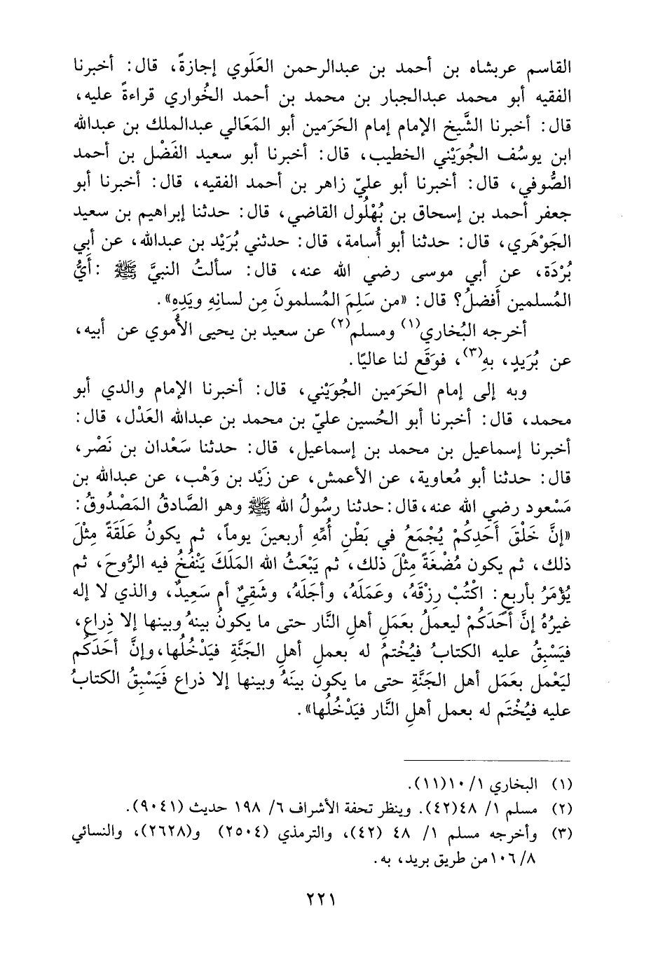 الْقَاسِمِ عَرَبْشَاهِ بْنُ أَحْمَدَ بْنِ عَبْدِ الرَّحْمَنِ الْعَلَوِيُّ إِجَازَةً، قَالَ: أَخْبَرَنَا الْفَقِيهُ أَبُو مُحَمَّدٍ عَبْدُ الْجَبَّارِ بْنُ مُحَمَّدِ بْنِ أَحْمَدَ الْخُوَارِيُّ قِرَاءَةً عَلَيْهِ، قَالَ: أَخْبَرَنَا الشَّيْخُ الإِمَامُ إِمَامُ الْحَرَمَيْنِ أَبُو الْمَعَالِي عَبْدُ الْمَلِكِ بْنُ عَبْدِ اللَّهِ بْنِ يُوسُفَ الْجُوَيْنِيُّ الْخَطِيبُ، قَالَ: أَخْبَرَنَا أَبُو سَعِيدٍ الْفَضْلُ بْنُ أَحْمَدَ الصُّوفِيُّ، قَالَ: أَخْبَرَنَا أَبُو عَلِيٍّ زَاهِرُ بْنُ أَحْمَدَ الْفَقِيهُ، قَالَ: أَخْبَرَنَا أَبُو جَعْفَرٍ أَحْمَدُ بْنُ إِسْحَاقَ بْنِ بُهْلُولٍ الْقَاضِي، قَالَ: حَدَّثَنَا إِبْرَاهِيمُ بْنُ سَعِيدٍ الْجَوْهَرِيُّ، قَالَ: حَدَّثَنَا أَبُو أُسَامَةَ، قَالَ: حَدَّثَنِي بُرَيْدُ بْنُ عَبْدِ اللَّهِ، عَنْ أَبِي بُرْدَةَ، عَنْ أَبِي مُوسَى رَضِيَ اللَّهُ عَنْهُ، قَالَ: سَأَلْتُ النَّبِيَّ صَلَّى اللَّهُ عَلَيْهِ وَسَلَّمَ: أَيُّ الْمُسْلِمِينَ أَفْضَلُ؟ قَالَ: ((مَنْ سَلِمَ الْمُسْلِمُونَ مِنْ لِسَانِهِ وَيَدِهِ)) .