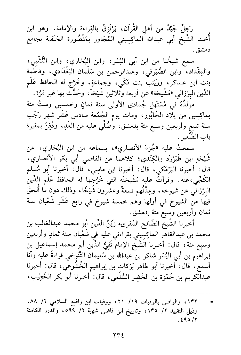 رجلٌ جيدٌ مِنْ أَهْلِ الْقُرْآنِ، يَرْتَزِقُ بِالْقِرَاءَةِ وَالإِمَامَةِ، وَهُوَ ابْنُ أُخْتِ الشَّيْخِ أَبِي عَبْدِ اللَّهِ الْمَاكِسِينِيِّ الْمُجَاوِرِ بِمَقْصُورَةِ الْحَنَفِيَّةِ بِجَامِعِ دِمَشْقَ.