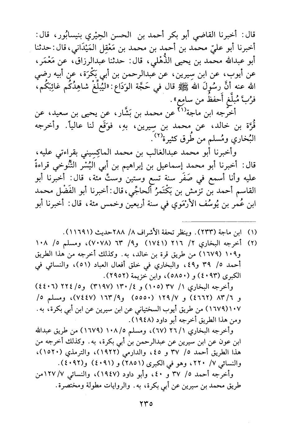 قَالَ: أَخْبَرَنَا الْقَاضِي أَبُو بَكْرٍ أَحْمَدُ بْنُ الْحَسَنِ الْحِيرِيُّ بِنَيْسَابُورَ، قَالَ: أَخْبَرَنَا أَبُو عَلِيٍّ مُحَمَّدُ بْنُ أَحْمَدَ بْنِ مُحَمَّدِ بْنِ مَعْقِلٍ الْمَيْدَانِيُّ، قَالَ: حَدَّثَنَا أَبُو عَبْدِ اللَّهِ مُحَمَّدُ بْنُ يَحْيَى الذُّهْلِيُّ، قَالَ: حَدَّثَنَا عَبْدُ الرَّزَّاقِ، عَنْ مَعْمَرٍ، عَنْ أَيُّوبَ، عَنِ ابْنِ سِيرِينَ، عَنْ عَبْدِ الرَّحْمَنِ بْنِ أَبِي بَكْرَةَ، عَنْ أَبِيهِ رَضِيَ اللَّهُ عَنْهُ أَنَّ رَسُولَ اللَّهِ صَلَّى اللَّهُ عَلَيْهِ وَسَلَّمَ قَالَ فِي حَجَّةِ الْوَدَاعِ: ((لِيُبَلِّغْ شَاهِدُكُمْ غَائِبَكُمْ، فَرُبَّ مبلغٍ أَحْفَظُ مِنْ سَامِعٍ)) .