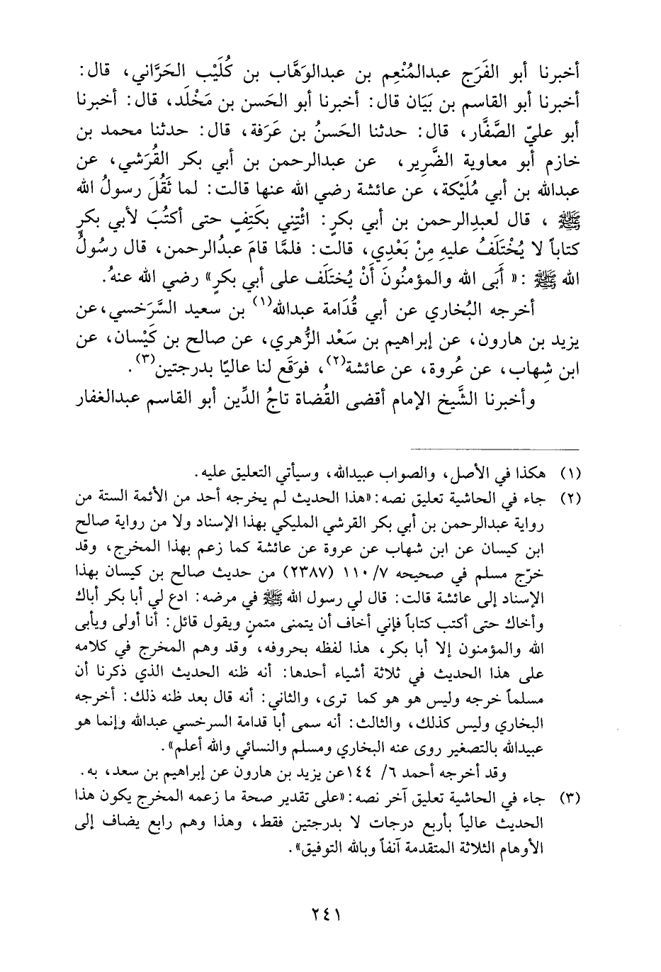 أَخْبَرَنَا أَبُو الْفَرَجِ عَبْدُ الْمُنْعِمِ بْنُ عَبْدِ الْوَهَّابِ بْنِ كُلَيْبٍ الْحَرَّانِيُّ، قَالَ: أَخْبَرَنَا أَبُو الْقَاسِمِ بْنُ بَيَانٍ قَالَ: أَخْبَرَنَا أَبُو الْحَسَنِ بْنُ مَخْلَدٍ، قَالَ: أَخْبَرَنَا أَبُو عَلِيٍّ الصَّفَّارُ، قَالَ: حَدَّثَنَا الْحَسَنُ بْنُ عَرَفَةَ، قَالَ: حَدَّثَنَا مُحَمَّدُ بْنُ خَازِمٍ أَبُو مُعَاوِيَةَ الضَّرِيرِ، عَنْ عَبْدِ الرَّحْمَنِ بْنِ أَبِي بَكْرٍ الْقُرَشِيُّ، عَنْ عَبْدِ اللَّهِ بْنِ أَبِي مُلَيْكَةَ، عَنْ عَائِشَةَ رَضِيَ اللَّهُ عَنْهَا قَالَتْ: لَمَّا ثَقُلَ رَسُولُ اللَّهِ صَلَّى اللَّهُ عَلَيْهِ وَسَلَّمَ، قَالَ لِعَبْدِ الرَّحْمَنِ بْنِ أَبِي بَكْرٍ: ائْتِنِي بكتفٍ حَتَّى أَكْتُبَ لأَبِي بَكْرٍ كِتَابًا لا يُخْتَلَفُ عَلَيْهِ مِنْ بَعْدِي، قَالَتْ: فَلَمَّا قَامَ عَبْدُ الرَّحْمَنِ، قَالَ رَسُولُ اللَّهِ صَلَّى اللَّهُ عَلَيْهِ وَسَلَّمَ: ((أَبَى اللَّهُ وَالْمُؤْمِنُونَ أَنْ يُخْتَلَفَ عَلَى أَبِي بكرٍ)) رَضِيَ اللَّهُ عَنْهُ.