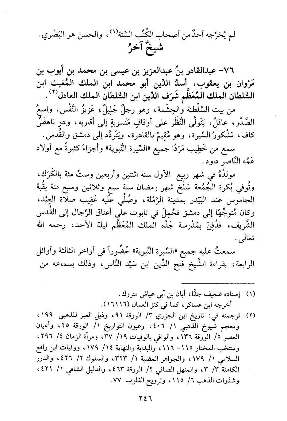 76- عَبْدُ الْقَادِرِ بْنُ عَبْدِ الْعَزِيزِ بْنِ عِيسَى بْنِ مُحَمَّدِ بْنِ أَيُّوبَ بْنِ مَرْوَانَ بْنِ يَعْقُوبَ، أَسَدُ الدين أبو محمد ابن الْمَلِكِ الْمُغِيثِ ابْنِ السُّلْطَانِ الْمَلِكِ الْمُعَظَّمِ شَرَفِ الدِّينِ ابْنِ السُّلْطَانِ الْمَلِكِ الْعَادِلِ.