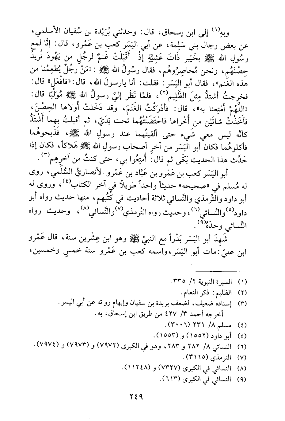 أَبُو الْيُسْرِ كَعْبُ بْنُ عَمْرِو بْنِ عَبَّادِ بْنِ عَمْرٍو الأَنْصَارِيُّ السُّلَمِيُّ، رَوَى لَهُ مُسْلِمٌ فِي ((صَحِيحِهِ)) حَدِيثًا وَاحِدًا طَوِيلا فِي آخِرِ الْكِتَابِ، وَرَوَى لَهُ أَبُو دَاوُدَ وَالتِّرْمِذِيُّ وَالنَّسَائِيُّ ثَلاثَةَ أَحَادِيثَ فِي كُتُبِهِمْ، مِنْهَا حَدِيثٌ رَوَاهُ أَبُو دَاوُدَ وَالنَّسَائِيُّ، وَحَدِيثٌ رَوَاهُ التِّرْمِذِيُّ وَالنَّسَائِيُّ، وَحَدِيثٌ رَوَاهُ النَّسَائِيُّ وَحْدَهُ.