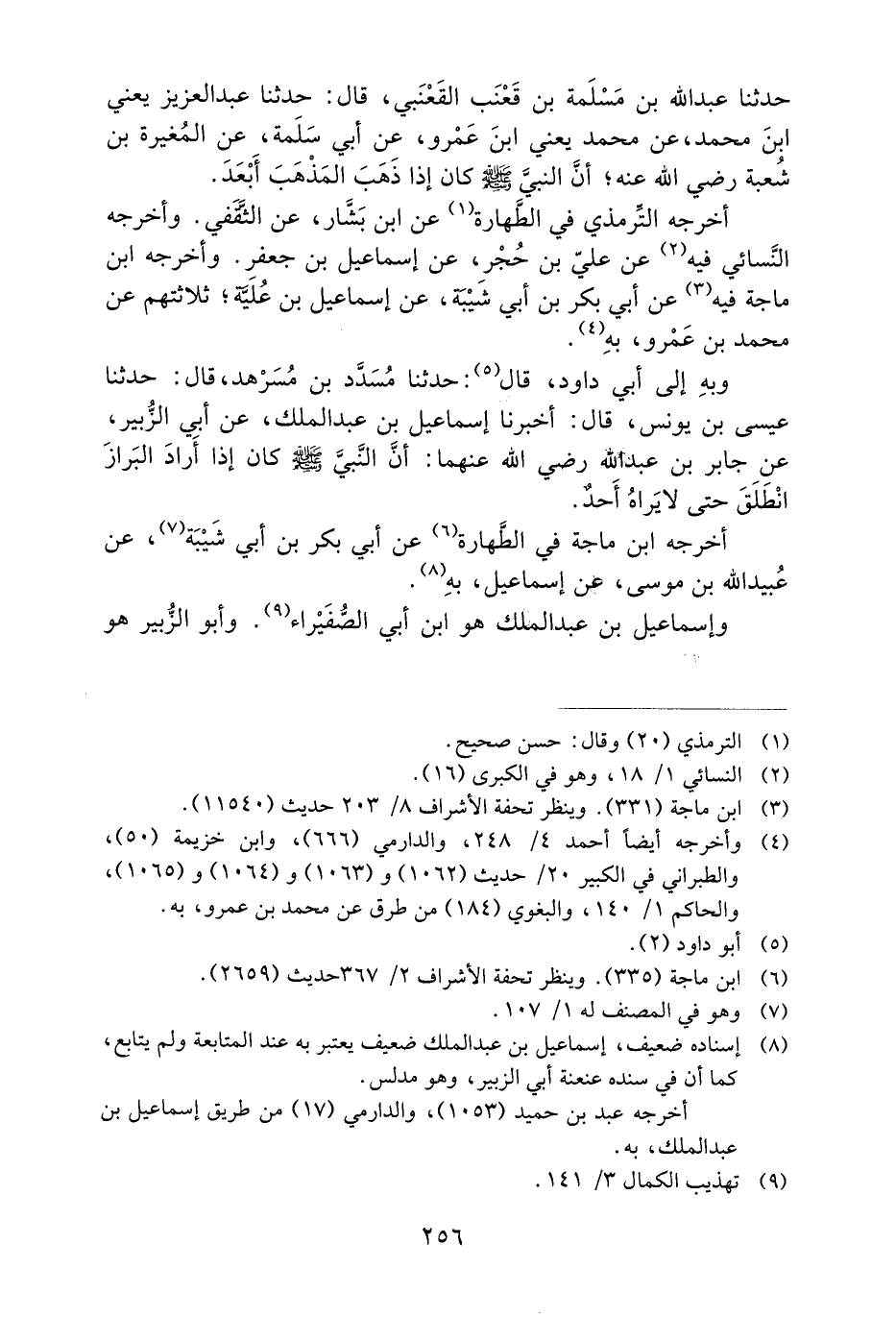 أَخْرَجَهُ التِّرْمِذِيُّ فِي الطَّهَارَةِ عَنِ ابْنِ بَشَّارٍ، عَنِ الثَّقَفِيِّ. وأَخْرَجَهُ النَّسَائِيُّ فِيهِ عَنْ عَلِيِّ بْنِ حُجْرٍ، عَنْ إِسْمَاعِيلَ بْنِ جَعْفَرٍ. وَأَخْرَجَهُ ابْنُ مَاجَهْ فِيهِ عَنْ أَبِي بَكْرِ بْنِ أبي شيبة، عن إسماعيل بن عُلَيَّةَ، ثَلاثَتُهُمْ عَن مُحَمَّدِ بْنِ عَمْرٍو، بِهِ.