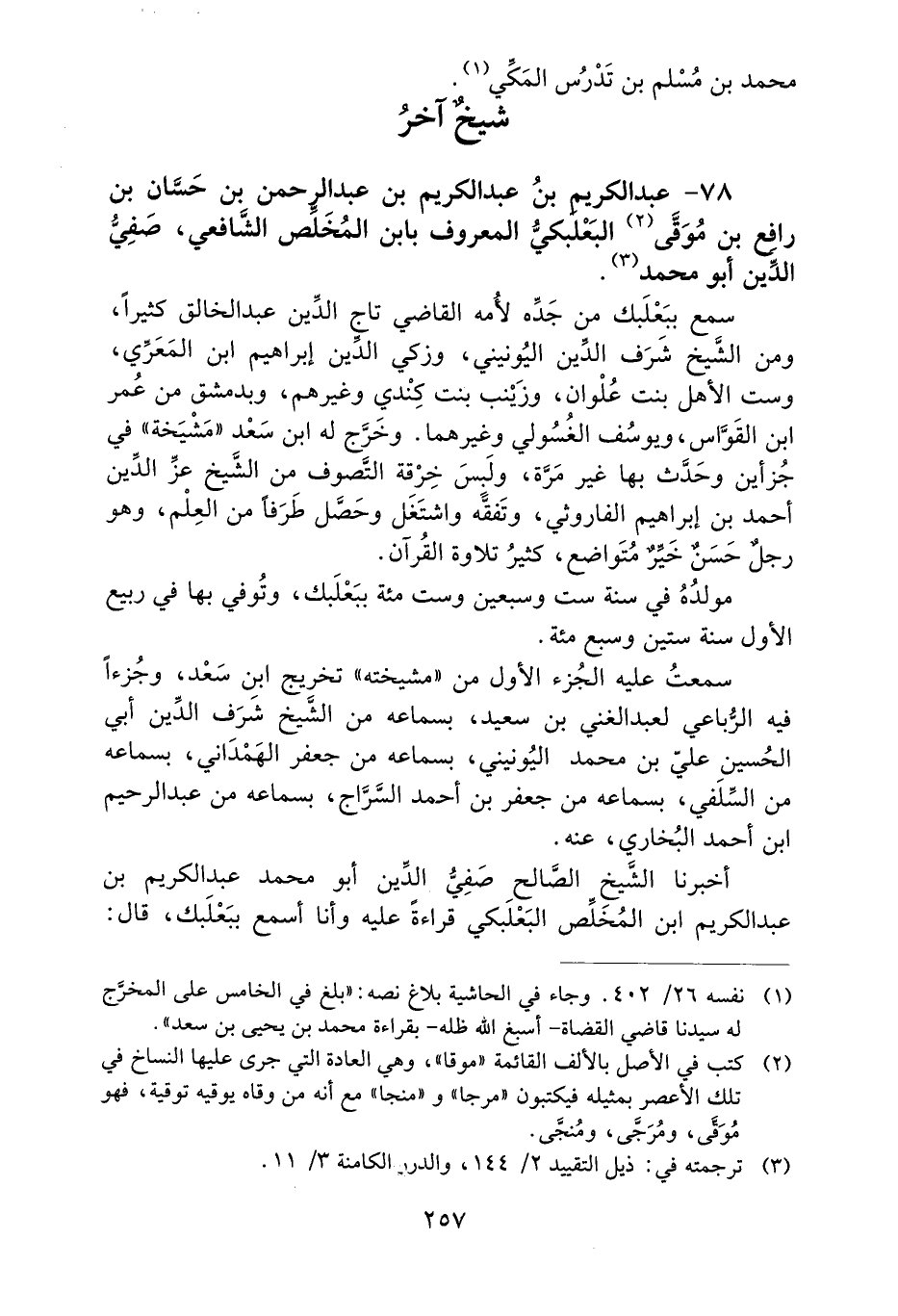 78- عَبْدُ الْكَرِيمِ بْنُ عَبْدِ الْكَرِيمِ بْنِ عَبْدِ الرَّحْمَنِ بْنِ حَسَّانِ بْنِ رَافِعِ بْنِ مُوَقًّى الْبَعْلَبَكِّيُّ الْمَعْرُوفُ بِابْنِ الْمُخَلِّصِ الشَّافِعِيِّ، صَفِيُّ الدِّينِ أَبُو مُحَمَّدٍ.