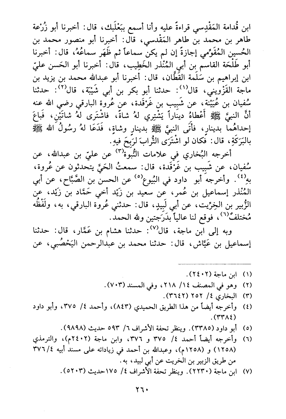 ابن قُدَامَةَ الْمَقْدِسِيُّ قِرَاءَةً عَلَيْهِ وَأَنَا أَسْمَعُ بِبَعْلَبَكَّ، قَالَ: أَخْبَرَنَا أَبُو زُرْعَةَ طَاهِرُ بْنُ مُحَمَّدِ بْنِ طَاهِرٍ الْمَقْدِسِيُّ، قَالَ: أَخْبَرَنَا أَبُو مَنْصُورٍ مُحَمَّدُ بْنُ الْحُسَيْنِ الْمُقَوِّمِيُّ إِجَازَةً إِنْ لَمْ يَكُنْ سَمَاعًا ثُمَّ ظَهَرَ سَمَاعُهُ، قَالَ أَخْبَرَنَا أَبُو طَلْحَةَ الْقَاسِمُ بْنُ أَبِي الْمُنْذِرِ الْخَطِيبُ، قَالَ: أَخْبَرَنَا أَبُو الْحَسَنِ عَلِيُّ بْنُ إِبْرَاهِيمَ بْنِ سَلَمَةَ الْقَطَّانُ، قَالَ: أَخْبَرَنَا أَبُو عَبْدِ اللَّهِ مُحَمَّدُ بْنُ يَزِيدَ بْنِ مَاجَهْ الْقَزْوِينِيُّ، قَالَ: حَدَّثَنَا أَبُو بَكْرِ بْنُ أَبِي شَيْبَةَ، قَالَ: حَدَّثَنَا سُفْيَانُ بْنُ عُيَيْنَةَ، عَنْ شَبِيبِ بْنِ غَرْقَدَةَ، عَنْ عُرْوَةَ الْبَارِقِيِّ رَضِيَ اللَّهُ عَنْهُ أَنَّ النَّبِيَّ صَلَّى اللَّهُ عَلَيْهِ وَسَلَّمَ أَعْطَاهُ دِينَارًا يَشْتَرِي لَهُ شَاةً، فَاشْتَرَى لَهُ شَاتَيْنِ، فَبَاعَ إِحْدَاهُمَا بِدِينَارٍ، فَأَتَى النَّبِيَّ صَلَّى اللَّهُ عَلَيْهِ وَسَلَّمَ بدينارٍ وشاةٍ، فَدَعَا لَهُ رَسُولُ اللَّهِ صَلَّى اللَّهُ عَلَيْهِ وَسَلَّمَ بِالْبَرَكَةِ، قَالَ: فَكَانَ لَوِ اشْتَرَى التُّرَابَ لَرَبِحَ فِيهِ.