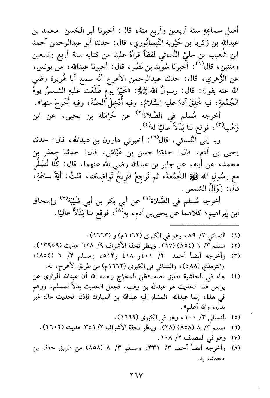 أصل سماعه سنة أربعين وأربع مئة، قَالَ: أَخْبَرَنَا أَبُو الْحَسَنِ مُحَمَّدُ بْنُ عَبْدِ اللَّهِ بْنِ زَكَرِيَّا بْنِ حَيُّوَيْهِ النَّيْسَابُورِيُّ، قَالَ: حَدَّثَنَا أَبُو عَبْدِ الرَّحْمَنِ أَحْمَدُ بْنُ شُعَيْبِ بْنِ عَلِيٍّ النَّسَائِيُّ لَفْظًا قَرَأَهُ عَلَيْنَا مِنْ كتابه سنة أربع وتسعين ومئتين، قَالَ: أَخْبَرَنَا سُوَيْدُ بْنُ نَصْرٍ، قَالَ: أَخْبَرَنَا عَبْدُ اللَّهِ، عَنْ يُونُسَ، عَنِ الزُّهْرِيِّ، قَالَ: حَدَّثَنَا عَبْدُ الرَّحْمَنِ الأَعْرَجُ أَنَّهُ سَمِعَ أَبَا هُرَيْرَةَ رَضِيَ اللَّهُ عَنْهُ يَقُولُ: قَالَ: رَسُولُ اللَّهِ صَلَّى اللَّهُ عَلَيْهِ وَسَلَّمَ: ((خَيْرُ يَوْمٍ طَلَعَتْ عَلَيْهِ الشَّمْسُ يَوْمُ الْجُمُعَةِ، فِيهِ خُلِقَ آدَمُ عَلَيْهِ السَّلامُ، وَفِيهِ أُدْخِلَ الْجَنَّةَ، وَفِيهِ أُخْرِجَ مِنْهَا)) .