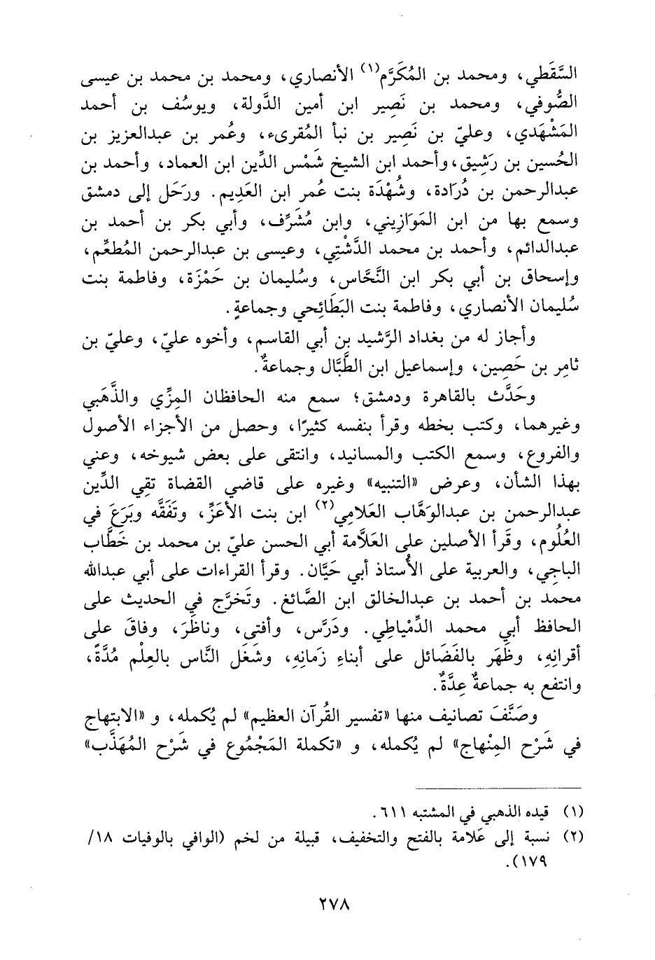 وَحَدَّثَ بِالْقَاهِرَةِ وَدِمَشْقَ؛ سَمِعَ مِنْهُ الْحَافِظَانِ الْمِزِّيُّ وَالذَّهَبِيُّ وَغَيْرُهُمَا، وَكَتَبَ بِخَطِّهِ، وَقَرَأَ بِنَفْسِهِ كَثِيرًا، وَحَّصَل مِنَ الأَجْزَاءِ الأُصُولَ وَالْفُرُوعَ، وَسَمِعَ الْكُتُبَ وَالْمَسَانِيدَ، وَانْتَقَى عَلَى بَعْضِ شُيُوخِهِ، وَعُنِيَ بِهَذَا الشَّأْنِ، وَعَرَضَ ((التَّنْبِيهَ)) وَغَيْرَهُ عَلَى قَاضِي الْقُضَاةِ تَقِيِّ الدِّينِ عَبْدِ الرَّحْمَن بْنِ عَبْدِ الْوَهَّابِ الْعَلامِيِّ ابْنِ بِنْتِ الأَعَزِّ، وَتَفَقَّهَ وَبَرَعَ فِي الْعُلُومِ، وَقَرَأَ الأَصْلَيْنِ عَلَى الْعَلامَةِ أَبِي الْحَسَنِ عَلِيِّ بْنِ مُحَمَّدِ بْنِ خَطَّابٍ الْبَاجِيِّ، وَالْعَرَبِيَّةَ عَلَى الأُسْتَاذِ أَبِي حَيَّانَ. وَقَرَأَ الْقِرَاءَاتِ عَلَى أَبِي عَبْدِ اللَّهِ مُحَمَّدِ بْنِ أَحْمَدَ بْنِ عَبْدِ الْخَالِقِ ابْنِ الصَّائِغِ. وَتَخَرَّجَ فِي الْحَدِيثِ عَلَى الْحَافِظِ أَبِي مُحَمَّدٍ الدِّمْيَاطِيِّ. وَدَرَّسَ، وَأَفْتَى، وَنَاظَرَ، وَفَاقَ عَلَى أَقْرَانِهِ، وَظَهَرَ بِالْفَضَائِلِ عَلَى أَبْنَاءِ زَمَانِهِ، وَشَغَلَ النَّاسَ بِالْعِلْمِ مدة، وانتفع به جماعةٌ عدةٌ.