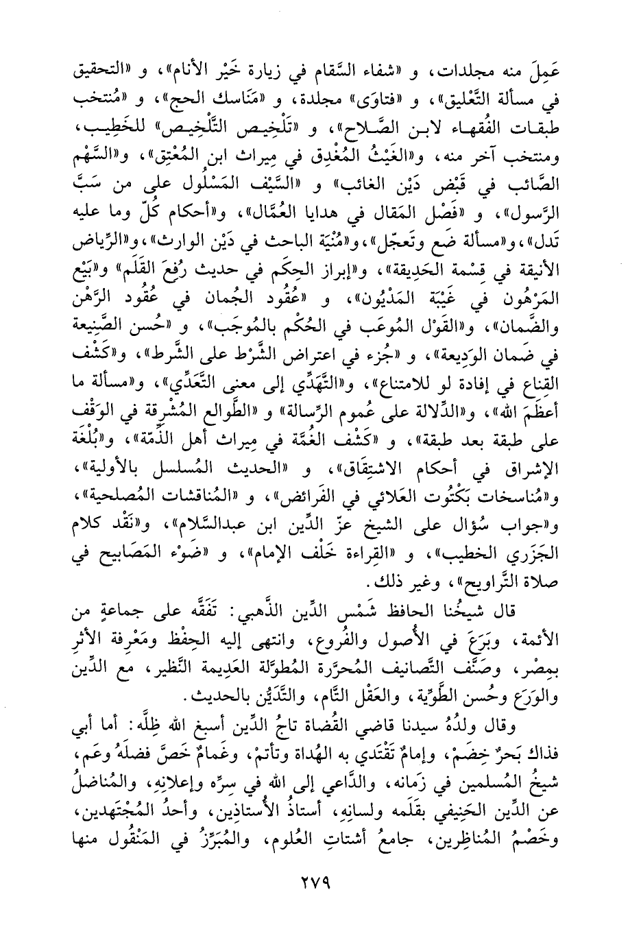 عمل منه مجلدات، و ((شفاء السقام في زيارة خير الأنام)) ، و ((التحقيق في مسألة التعليق)) ، و ((فتاوى مجلدة)) ، و ((مناسك الحج)) ، و ((منتخب طَبَقَاتِ الْفُقَهَاءِ لابْنِ الصَّلاحِ)) ، وَ ((تَلْخِيصُ التَّلْخِيصِ)) للخطيب، ومنتخب آخر منه، و ((الغيث المغدق في ميراث ابن المعتق)) ، و ((السهم الصائب في قبض دين الغائب)) و ((السيف المسلول على من سب الرسول)) ، و ((فصل المقال في هدايا العمال)) ، و ((أحكام كل وما عليه تدل)) ، و ((مسألة ضع وتعجل)) ، و ((منية الباحث في دين الوارث)) ، و ((الرياض الأنيقة في قسمة الحديقة)) ، و ((إبراز الحكم في حديث رفع القلم)) ، و ((بيع المرهون في غيبة المديون)) ، و ((عقود الْجُمَانِ فِي عُقُودِ الرَّهْنِ وَالضَّمَانِ)) ، وَ ((الْقَوْلُ الموعب في الحكم بالموجب)) ، و ((حسن الصنيعة في ضمان الوديعة)) ، و ((جزء في اعتراض الشرط على الشرط)) ، و ((كشف القناع في إفادة لو للامتناع)) ، و ((التهدي إلى معنى التعدي)) ، و ((مسألة ما أعظم الله)) ، و ((الدلالة على عموم الرسالة)) و ((الطوالع المشرقة في الوقف على طبعة بعد طبقة)) ، و ((كشف الغمة في ميراث أهل الذمة)) ، و ((بلغة الإشراق في أحكام الاشتقاق)) ، و ((الحديث المسلسل بالأولية)) ، و ((مناسخات بكتوت العلائي في الفرائض)) ، و ((المناقشات المصلحية)) ، و ((جواب سؤال على الشيخ عز الدين ابن عبد السلام)) ، و ((نقد كلام الجزري الخطيب)) ، و ((القراءة خلف الإمام)) ، و ((ضوء الْمَصَابِيحِ فِي صَلاةِ التَّرَاوِيحِ)) ، وَغَيْرُ ذَلِكَ.
