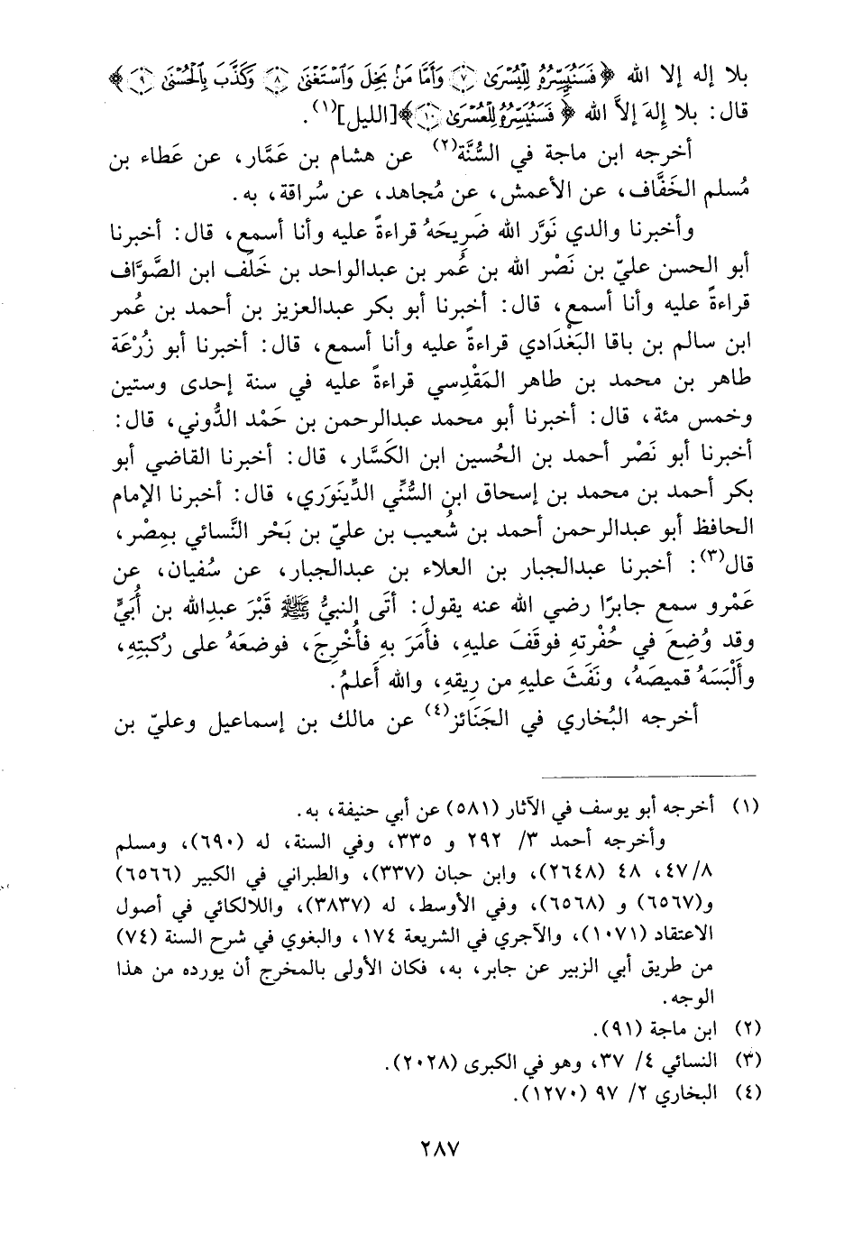 وأَخْبَرَنَا وَالِدِي نُورُ اللَّهِ ضَرِيحُهُ قِرَاءَةً عَلَيْهِ وَأَنَا أَسْمَعُ، قَالَ: أَخْبَرَنَا أَبُو الْحَسَنِ عَلِيُّ بْنُ نَصْرِ اللَّهِ بْنِ عُمَرَ بْنِ عَبْدِ الواحد بن خلف ابن الصَّوَّافِ قِرَاءَةً عَلَيْهِ وَأَنَا أَسْمَعُ، قَالَ: أَخْبَرَنَا أَبُو بَكْرٍ عَبْدُ الْعَزِيزِ بْنُ أَحْمَدَ بْنِ عُمَرَ بْنِ سَالِمِ بْنِ بَاقَا الْبَغْدَادِيُّ قِرَاءَةً عَلَيْهِ وَأَنَا أَسْمَعُ، قَالَ: أَخْبَرَنَا أَبُو زُرْعَةَ طَاهِرُ بْنُ مُحَمَّدِ بْنِ طَاهِرٍ الْمَقْدِسِيُّ قِرَاءَةً عليه في سنة إحدى وستين وخمس مئة، قَالَ: أَخْبَرَنَا أَبُو مُحَمَّدٍ عَبْدُ الرَّحْمَنِ بْنُ حَمْدٍ الدُّونِيُّ، قَالَ: أَخْبَرَنَا أَبُو نَصْرٍ أَحْمَدُ بن الحسين ابن الْكَسَّارِ، قَالَ: أَخْبَرَنَا الْقَاضِي أَبُو بَكْرٍ أَحْمَدُ بْنُ مُحَمَّدِ بْنِ إِسْحَاقَ ابْنِ السُّنِّيِّ الدِّينَوَرِيُّ، قَالَ: أَخْبَرَنَا الإِمَامُ الْحَافِظُ أَبُو عَبْدِ الرَّحْمَنِ أَحْمَدُ بْنُ شُعَيْبِ بْنِ عَلِيِّ بْنِ بَحْرٍ النَّسَائِيُّ بِمِصْرَ، قَالَ: أَخْبَرَنَا عَبْدُ الْجَبَّارِ بْنُ الْعَلاءِ بْنِ عَبْدِ الْجَبَّارِ، عَنْ سُفْيَانَ، عَنْ عَمْرٍو سَمِعَ جَابِرًا رَضِيَ اللَّهُ عَنْهُ يَقُولُ: أَتَى النَّبِيُّ صَلَّى اللَّهُ عَلَيْهِ وَسَلَّمَ قَبْرَ عَبْدِ اللَّهِ بْنِ أُبَيٍّ وَقَدْ وُضِعَ فِي حُفْرَتِهِ فَوَقَفَ عَلَيْهِ، فَأَمَرَ بِهِ فَأُخْرِجَ، فَوَضَعَهُ عَلَى رُكْبَتِهِ، وَأَلْبَسَهُ قَمِيصَهُ، وَنَفَثَ عَلَيْهِ مِنْ رِيقِهِ، وَاللَّهُ أَعْلَمُ.