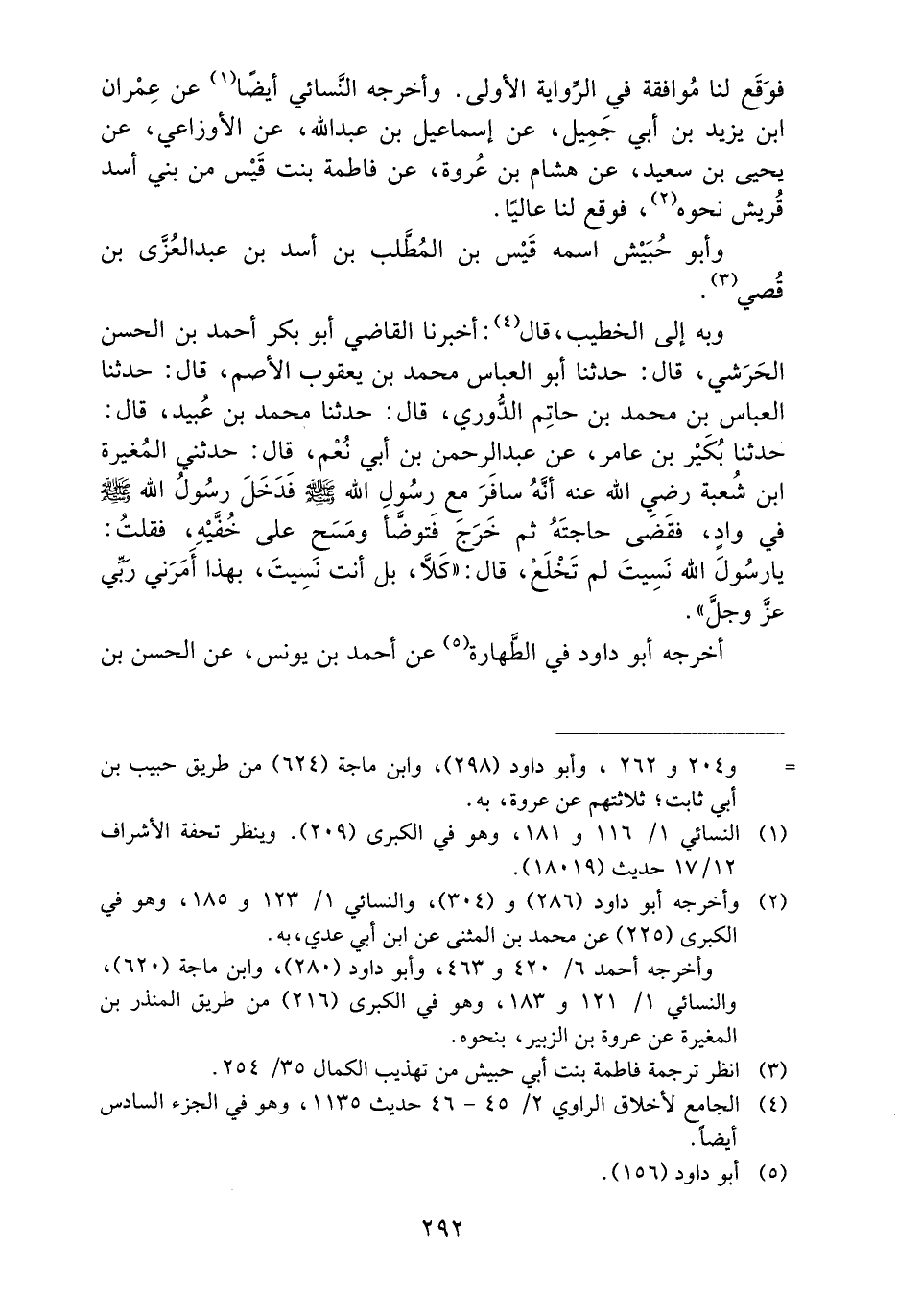 فَوَقَعَ لَنَا مُوَافَقَةً فِي الرِّوَايَةِ الأُولَى. وَأَخْرَجَهُ النسائي أيضاً عن عمران ابن يَزِيدَ بْنِ أَبِي جَمِيلٍ، عَنْ إِسْمَاعِيلَ بْنِ عَبْدِ اللَّهِ، عَنِ الأَوْزَاعِيِّ، عَنْ يَحْيَى بْنِ سَعِيدٍ، عَنْ هِشَامِ بْنِ عُرْوَةَ، عَنْ فَاطِمَةَ بِنْتِ قَيْسٍ مِنْ بَنِي أَسَدِ قُرَيْشٍ نَحْوَهُ، فَوَقَعَ لَنَا عَالِيًا.