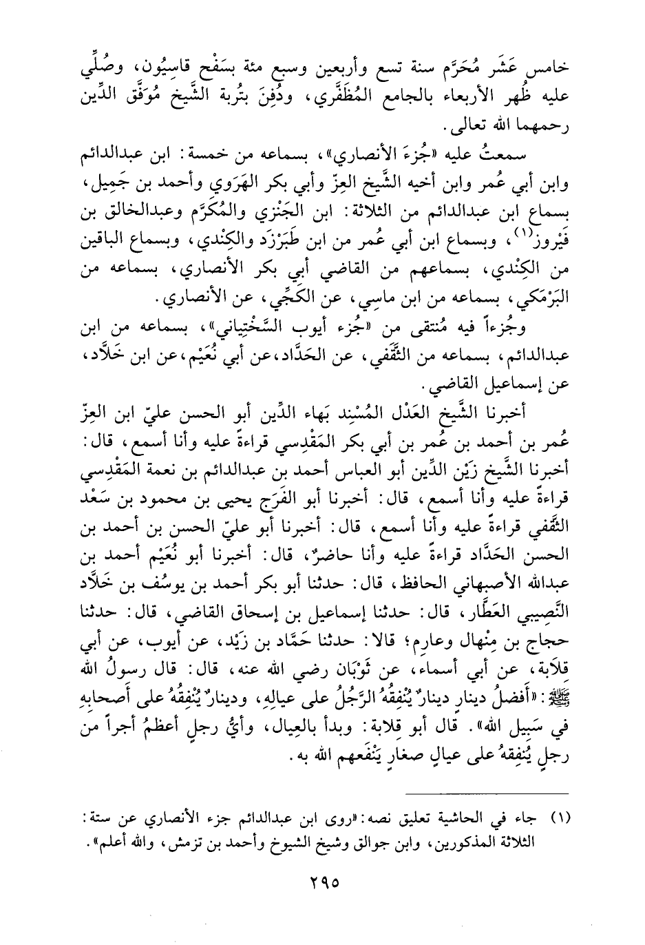 سَمِعْتُ عَلَيْهِ ((جُزْءَ الأَنْصَارِيِّ)) بِسَمَاعِهِ مِنْ خَمْسَةٍ: ابْنِ عَبْدِ الدَّائِمِ وَابْنِ أَبِي عُمَرَ وَابْنِ أَخِيهِ الشَّيْخِ الْعِزِّ وَأَبِي بَكْرٍ الْهَرَوِيِّ وَأَحْمَدَ بْنِ جَمِيلٍ، بِسَمَاعِ ابْنِ عَبْدِ الدَّائِمِ مِنَ الثَّلاثَةِ: ابْنِ الْجَنَزِيِّ وَالْمُكْرِمِ وَعَبْدِ الْخَالِقِ بْنِ فَيْرُوزَ، وَبِسَمَاعِ ابْنِ أَبِي عُمَرَ مِنَ ابْنِ طَبَرْزَدَ وَالْكِنْدِيِّ، وَبِسَمَاعِ الْبَاقِينَ مِنَ الْكِنْدِيِّ، بِسَمَاعِهِمْ مِنَ الْقَاضِي أَبِي بَكْرٍ الأَنْصَارِيِّ، بِسَمَاعِهِ مِنَ الْبَرْمَكِيِّ، بِسَمَاعِهِ مِنَ ابْنِ مَاسِيٍّ، عَنِ الْكَجِّيِّ، عَنِ الأَنْصَارِيِّ.