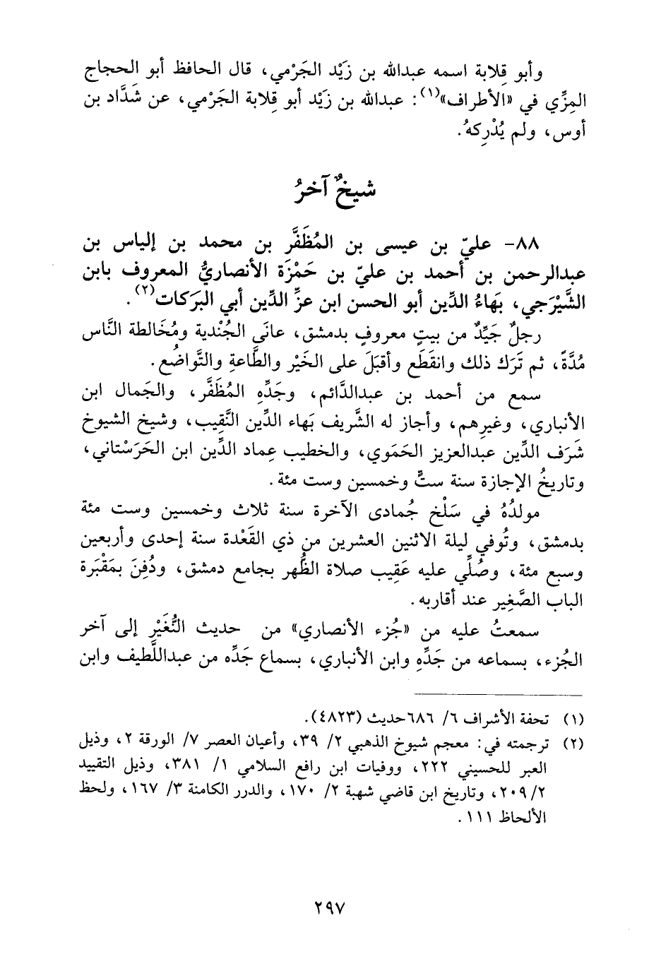 88- عَلِيُّ بْنُ عِيسَى بْنِ الْمُظَفَّرِ بْنِ مُحَمَّدِ بْنِ إِلْيَاسَ بْنِ عَبْدِ الرَّحْمَنِ بْنِ أَحْمَدَ بْنِ عَلِيِّ بْنِ حَمْزَةَ الأَنْصَارِيُّ الْمَعْرُوفُ بِابْنِ الشِّيرَجِيِّ، بَهَاءُ الدِّينِ أَبُو الْحَسَنِ ابن عِزِّ الدِّينِ أَبِي الْبَرَكَاتِ.