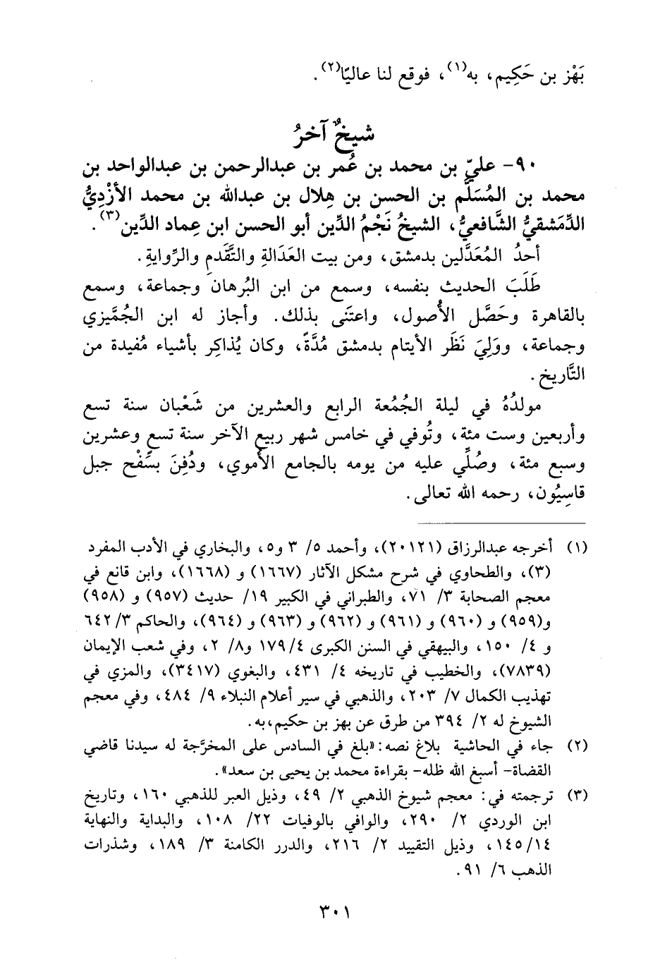 90- عَلِيُّ بْنُ مُحَمَّدِ بْنِ عُمَرَ بْنِ عَبْدِ الرَّحْمَنِ بْنِ عَبْدِ الْوَاحِدِ بْنِ مُحَمَّدِ بْنِ الْمُسْلِمِ بْنِ الْحَسَنِ بْنِ هِلالٍ بْنِ عَبْدِ اللَّهِ بْنِ مُحَمَّدٍ الأَزْدِيُّ الدِّمَشْقِيُّ الشافعي، الشيخ نجم الدين أبو الحسن ابن عِمَادِ الدِّينِ.