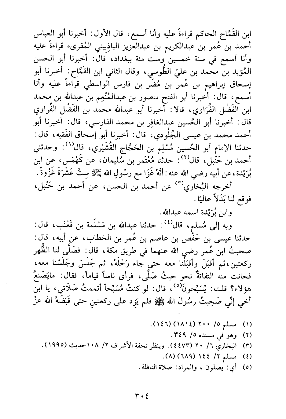 ابْنِ الْقَمَّاحِ الْحَاكِمِ قِرَاءَةً عَلَيْهِ وَأَنَا أَسْمَعُ، قَالَ الأَوَّلُ: أَخْبَرَنَا أَبُو الْعَبَّاسِ أَحْمَدُ بْنُ عُمَرَ بْنِ عَبْدِ الْكَرِيمِ بْنِ عَبْدِ الْعَزِيزِ الْبَاذِبِينِيُّ الْمُقْرِئُ قِرَاءَةً عَلَيْهِ وَأَنَا أَسْمَعُ فِي سنة خمسين وست مئة بِبَغْدَادَ، قَالَ: أَخْبَرَنَا أَبُو الْحَسَنِ الْمُؤَيَّدُ بْنُ مُحَمَّدِ بْنِ عَلِيٍّ الطُّوسِيُّ، وَقَالَ الثَّانِي ابْنُ الْقَمَّاحِ: أَخْبَرَنَا أَبُو إِسْحَاقَ إِبْرَاهِيمُ بْنُ عُمَرَ بْنِ مُضَرَ بْنِ فَارِسٍ الْوَاسِطِيُّ قِرَاءَةً عَلَيْهِ وَأَنَا أَسْمَعُ، قَالَ: أَخْبَرَنَا أَبُو الْفَتْحِ مَنْصُورُ بْنُ عَبْدِ الْمُنْعِمِ بْنِ عَبْدِ اللَّهِ بْنِ محمد ابن الْفَضْلِ الْفُرَاوِيُّ، قَالا: أَخْبَرَنَا أَبُو عَبْدِ اللَّهِ مُحَمَّدُ بْنُ الْفَضْلِ الْفُرَاوِيُّ قَالَ: أَخْبَرَنَا أَبُو الْحُسَيْنِ عَبْدُ الْغَافِرِ بْنُ مُحَمَّدٍ الْفَارِسِيُّ، قَالَ: أَخْبَرَنَا أَبُو أَحْمَدَ مُحَمَّدُ بْنُ عِيسَى الْجُلُودِيُّ، قَالَ: أَخْبَرَنَا أَبُو إِسْحَاقَ الْفَقِيهُ، قَالَ: حَدَّثَنَا الإِمَامُ أَبُو الْحُسَيْنِ مُسْلِمُ بْنُ الْحَجَّاجِ الْقُشَيْرِيُّ، قَالَ: وحَدَّثَنِي أَحْمَدُ بْنُ حَنْبَلٍ، قَالَ: حَدَّثَنَا مُعْتَمِرُ بْنُ سُلَيْمَانَ، عَنْ كَهْمَسٍ، عَنِ ابْنِ بُرَيْدَةَ، عَنْ أَبِيهِ رَضِيَ اللَّهُ عَنْهُ: أَنَّهُ غَزَا مَعَ رَسُولِ اللَّهِ صَلَّى اللَّهُ عَلَيْهِ وَسَلَّمَ سِتَّ عَشْرَةَ غَزْوَةً.