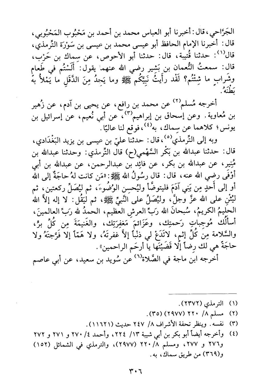 وَبِهِ إِلَى التِّرْمِذِيِّ، قَالَ: حَدَّثَنَا عَلِيُّ بْنُ عِيسَى بْنِ يَزِيدَ الْبَغْدَادِيُّ، قَالَ: حَدَّثَنَا عَبْدُ اللَّهِ بْنُ بَكْرٍ السَّهْمِيُّ (ح) قَالَ التِّرْمِذِيُّ: وَحَدَّثَنَا عَبْدُ اللَّهِ بْنُ مُنِيرٍ، عَنْ عَبْدِ اللَّهِ بْنِ بَكْرٍ، عَنْ فَائِدِ بْنِ عَبْدِ الرَّحْمَنِ، عَنْ عَبْدِ اللَّهِ بْنِ أَبِي أَوْفَى رَضِيَ اللَّهُ عَنْهُ، قَالَ: قَالَ رَسُولُ اللَّهِ صَلَّى اللَّهُ عَلَيْهِ وَسَلَّمَ: ((مَنْ كَانَتْ لَهُ حاجةٌ إِلَى اللَّهِ أَوْ إِلَى أحدٍ مِنْ بَنِي آدَمَ فَلْيَتَوَضَّأْ وَلْيُحْسِنِ الْوُضُوءَ، ثُمَّ لِيُصَلِّ رَكْعَتَيْنِ، ثُمَّ لِيُثْنِ عَلَى اللَّهِ عَزَّ وَجَلَّ، وَلْيُصَلِّ عَلَى النَّبِيِّ صَلَّى اللَّهُ عَلَيْهِ وَسَلَّمَ، ثُمَّ لِيَقُلْ: لا إِلَهَ إِلا اللَّهُ الْحَلِيمُ الْكَرِيمُ، سُبْحَانَ اللَّهِ رَبِّ الْعَرْشِ الْعَظِيمِ، الْحَمْدُ لِلَّهِ رَبِّ الْعَالَمِينَ، أَسْأَلُكَ مُوجِبَاتِ رَحْمَتِكَ، وَعَزَائِمَ مَغْفِرَتِكَ، وَالْغَنِيمَةَ مِنْ كُلِّ بِرٍّ، وَالسَّلامَةَ مِنْ كُلِّ إثم، لا تدع لي ذنباً إلى غَفَرْتَهُ، وَلا هَمًّا إِلا فَرَّجْتَهُ، وَلا حَاجَةً هِيَ لَكَ رِضًا إِلا قَضَيْتَهَا يَا أَرْحَمَ الرَّاحِمِينَ)) .